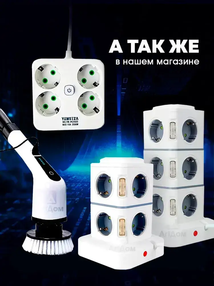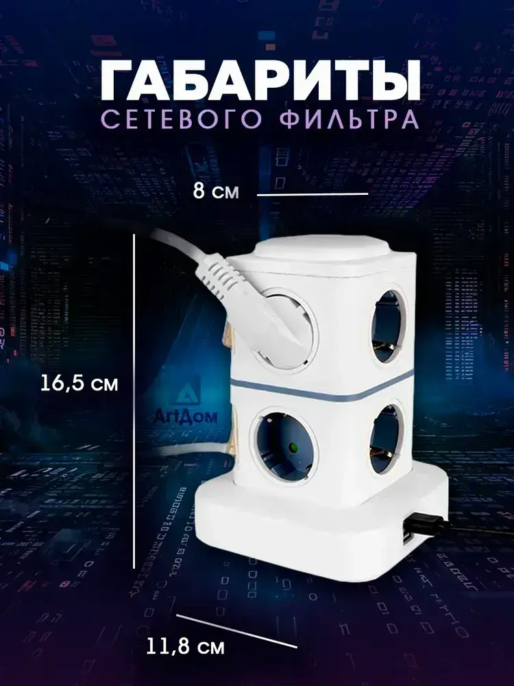 Сетевой фильтр удлинитель с предохранителем, 8 розеток, 2 USB, 2 Type-C и с кнопкой выключения