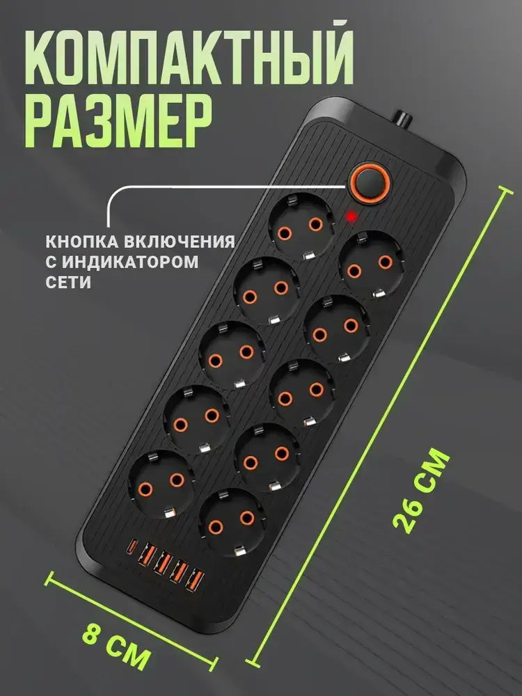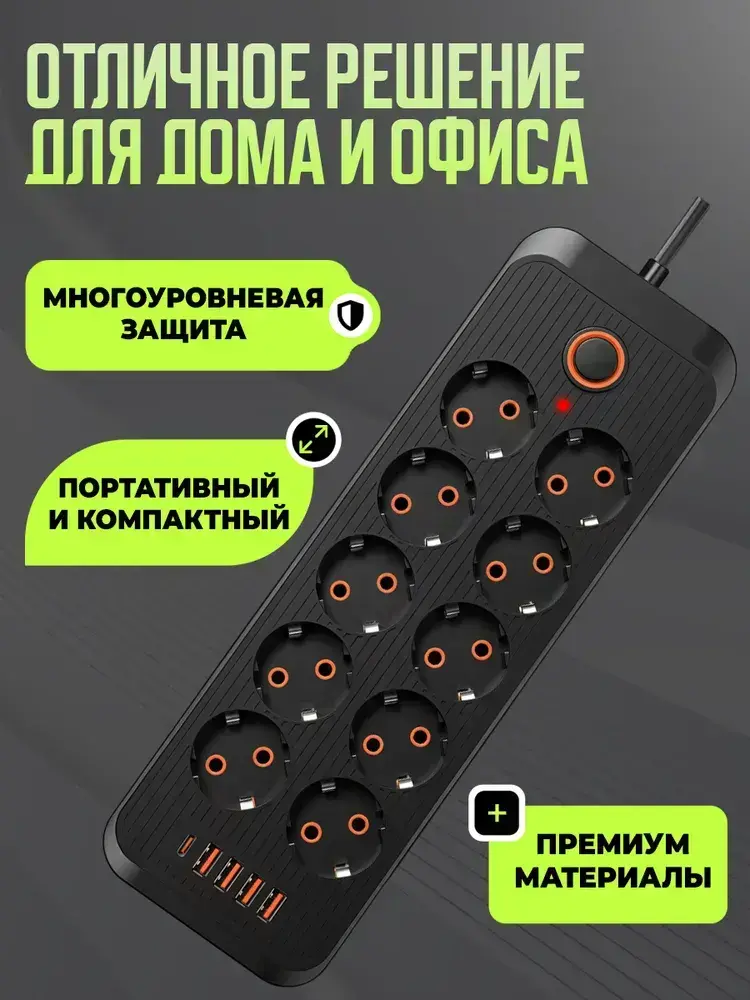 Сетевой фильтр, удлинитель сетевой 10м с USB и type-c. Пилот, тройник