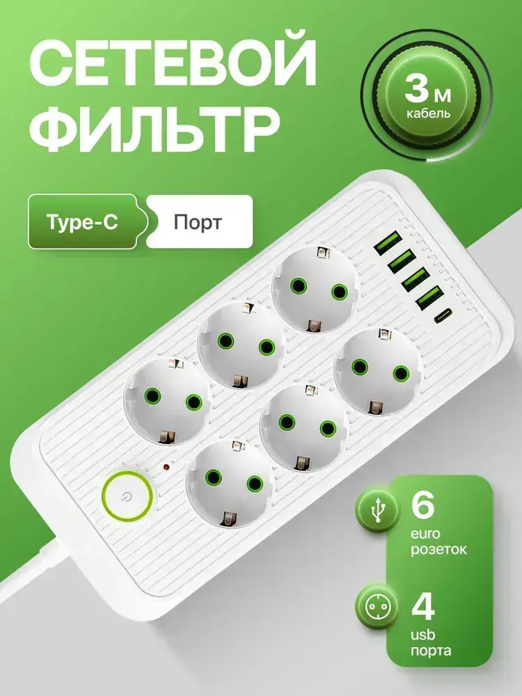 Сетевой фильтр, удлинитель сетевой 3м с USB и type-c. Пилот, тройник