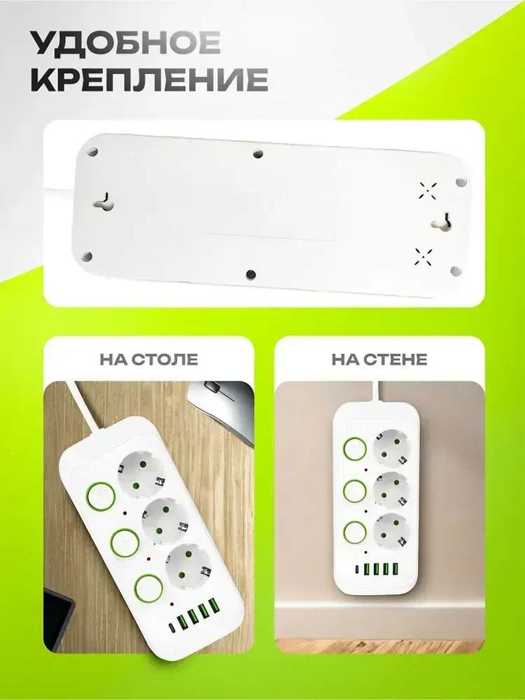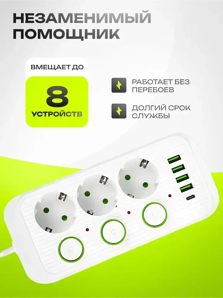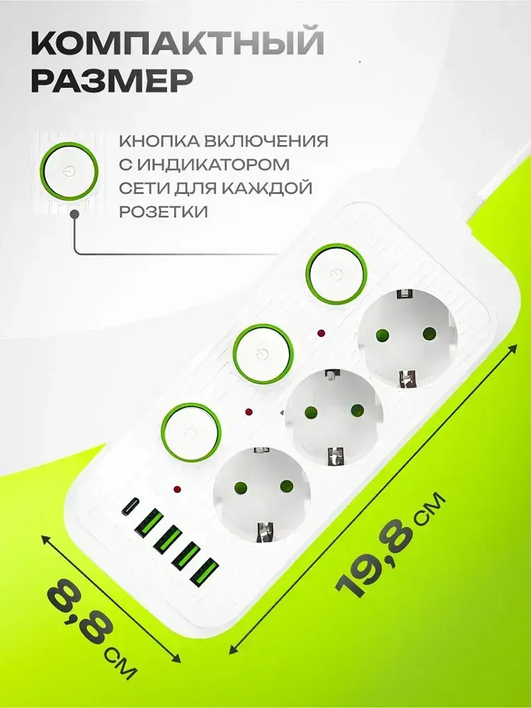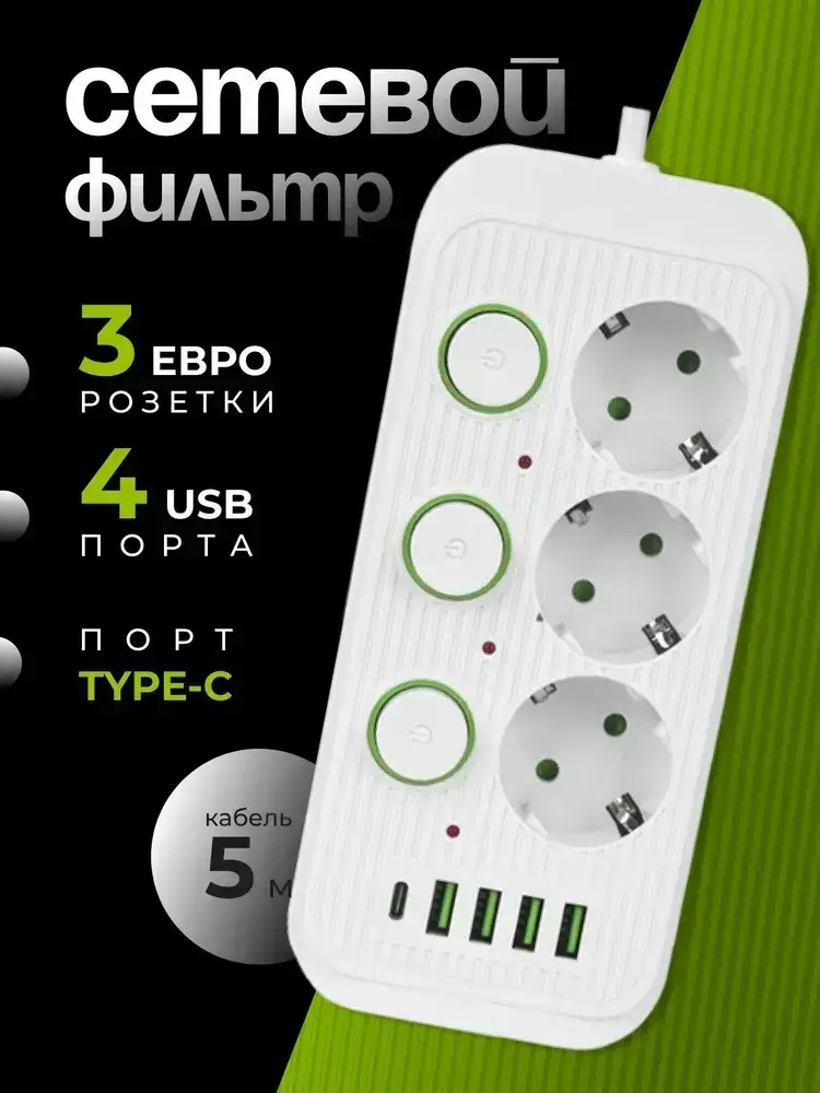 Сетевой фильтр, удлинитель сетевой 5м с USB и type-с. Пилот, тройник