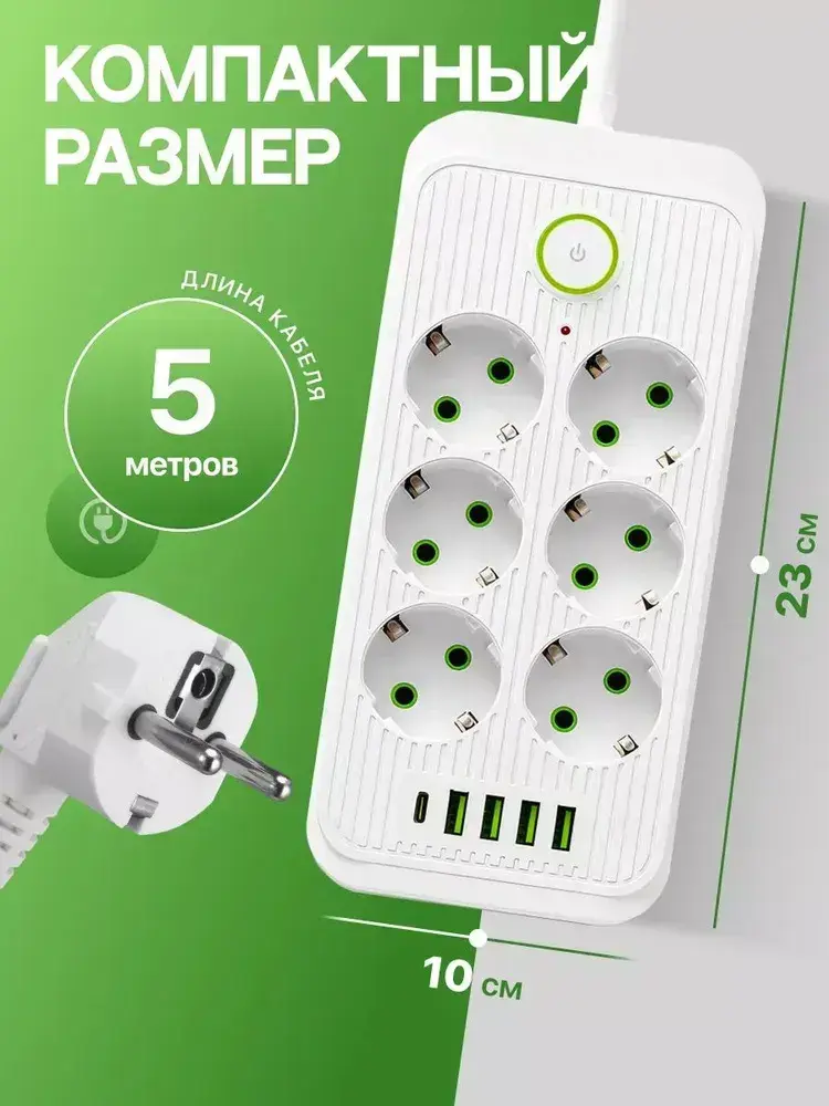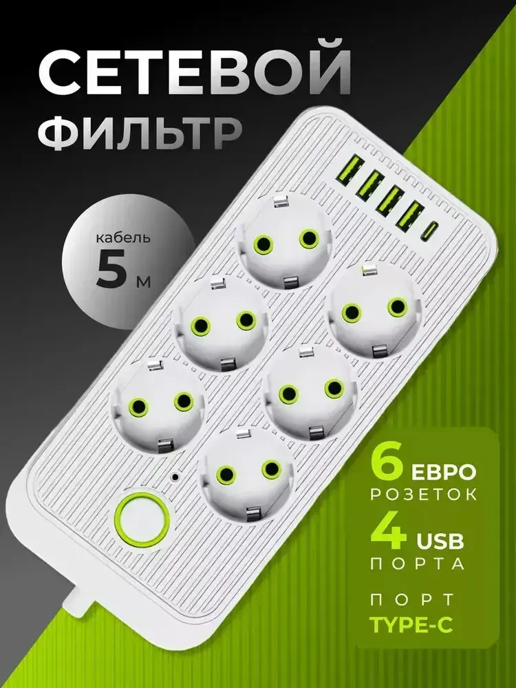 Сетевой фильтр USB 6 розетки / Удлинитель 3 метра белый