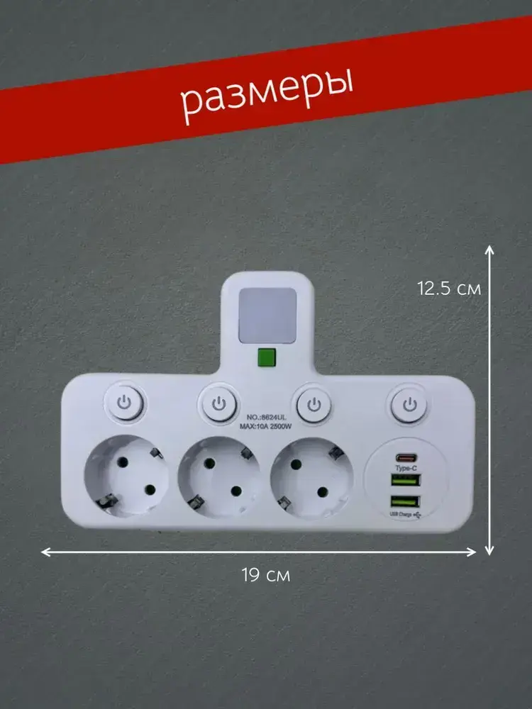 Сетевой разветвитель, тройник, 3 розетки, 2 USB, 1 Type-C