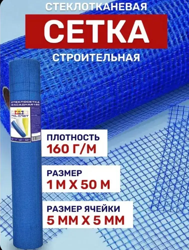 Сетка фасадная 5х5/ 50 м / синяя/ 160 г.м2/ штукатурная , стеклотканевая