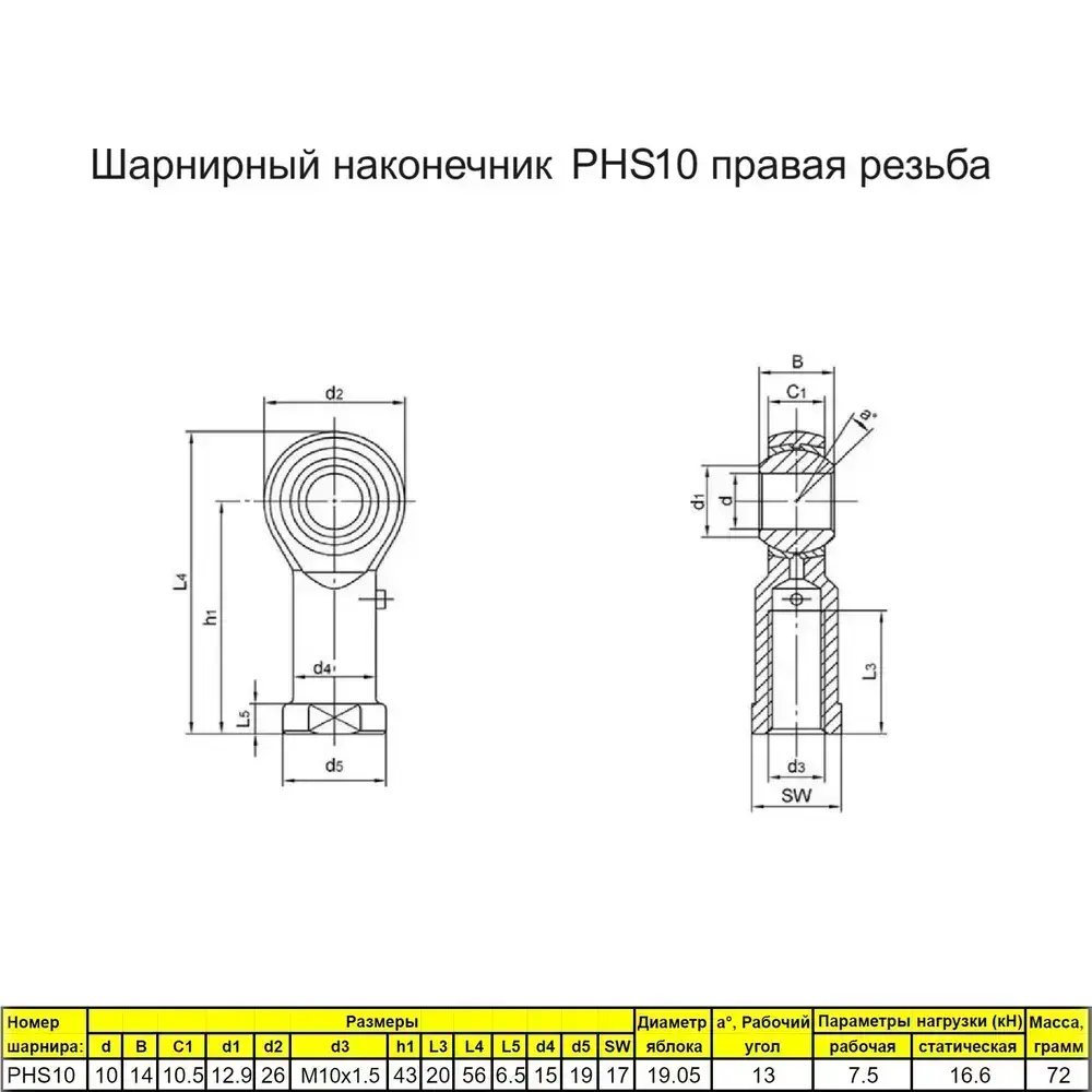 Шарнирный наконечник М10 / PHS10 внутренняя правая резьба / для ЧПУ и спецтехники