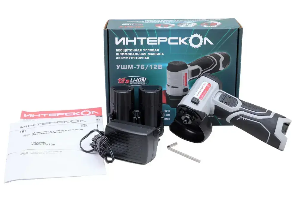 Шлифмашина угловая Интерскол УШМ-76/12В АПИ-Т Li-ion, 12В, б/щ, 2 АКБ 2,0Ач и ЗУ, 644.2.2.70