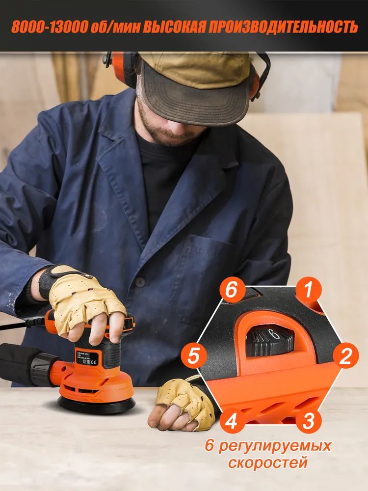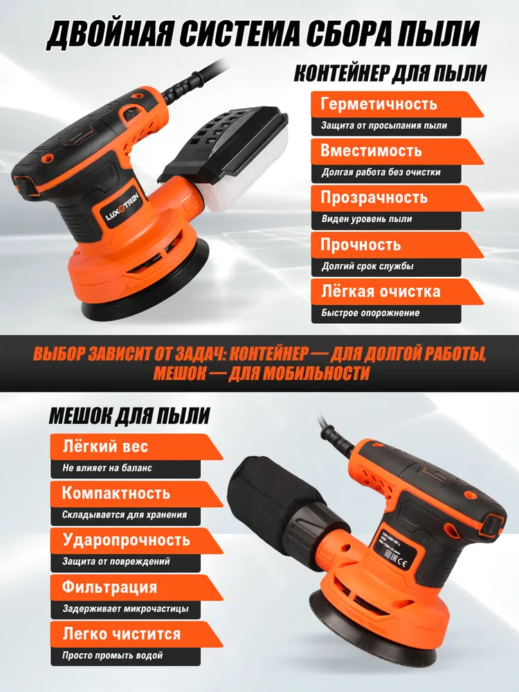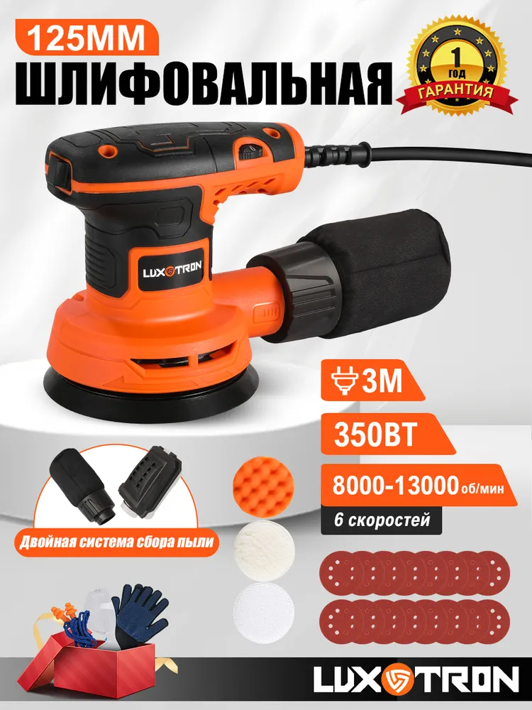 Шлифовальная машина эксцентриковая Luxotron, 320Вт, 8000 - 13000 об/мин, 16 штук шлифовальных бумаг, 125 мм