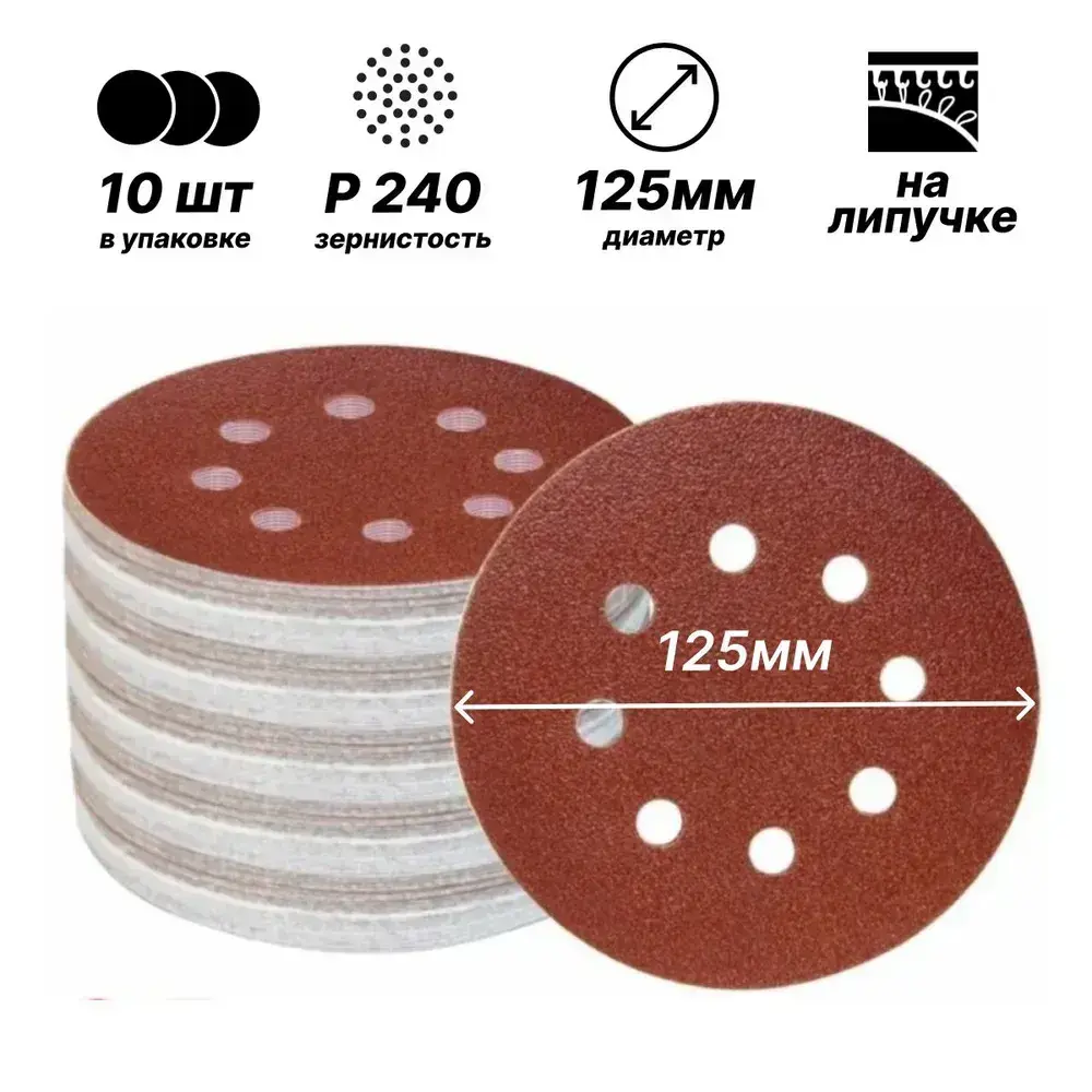Шлифовальный круг 125мм на липучке Р240/ 10шт/ 8 отверстий