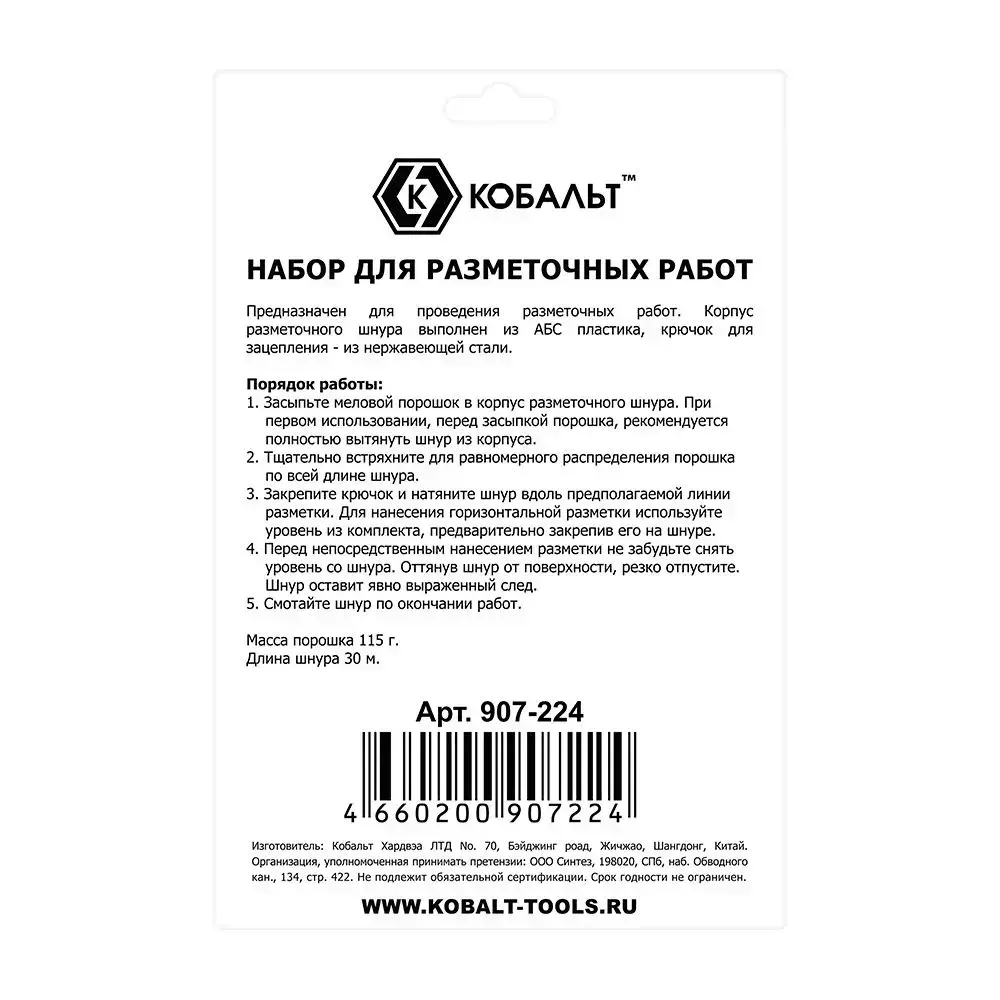 Шнур разметочный КОБАЛЬТ 30 метров + меловой порошок + уровень.