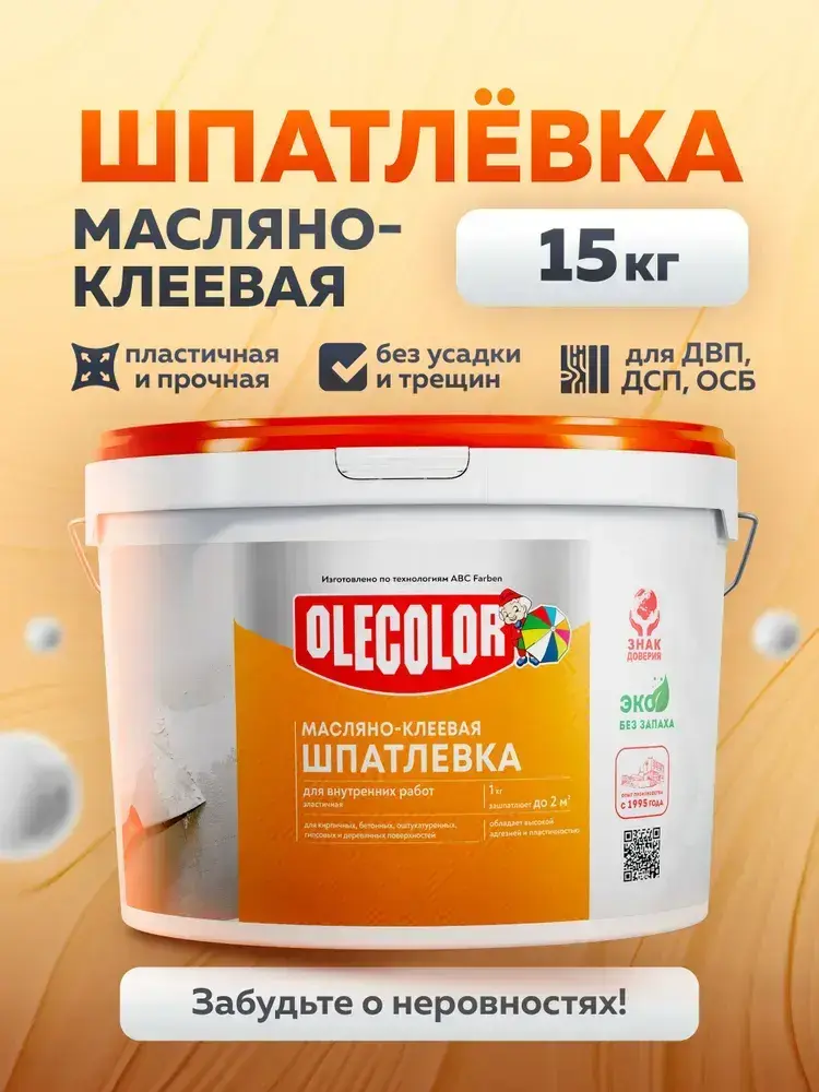 Шпатлевка для стен МАСЛЯНО-КЛЕЕВАЯ 15 кг OLECOLOR, Высокая эластичность, Готовая к применению, Шпаклевка для внутренних работ, для стен и потолков, для заделки трещин, белая