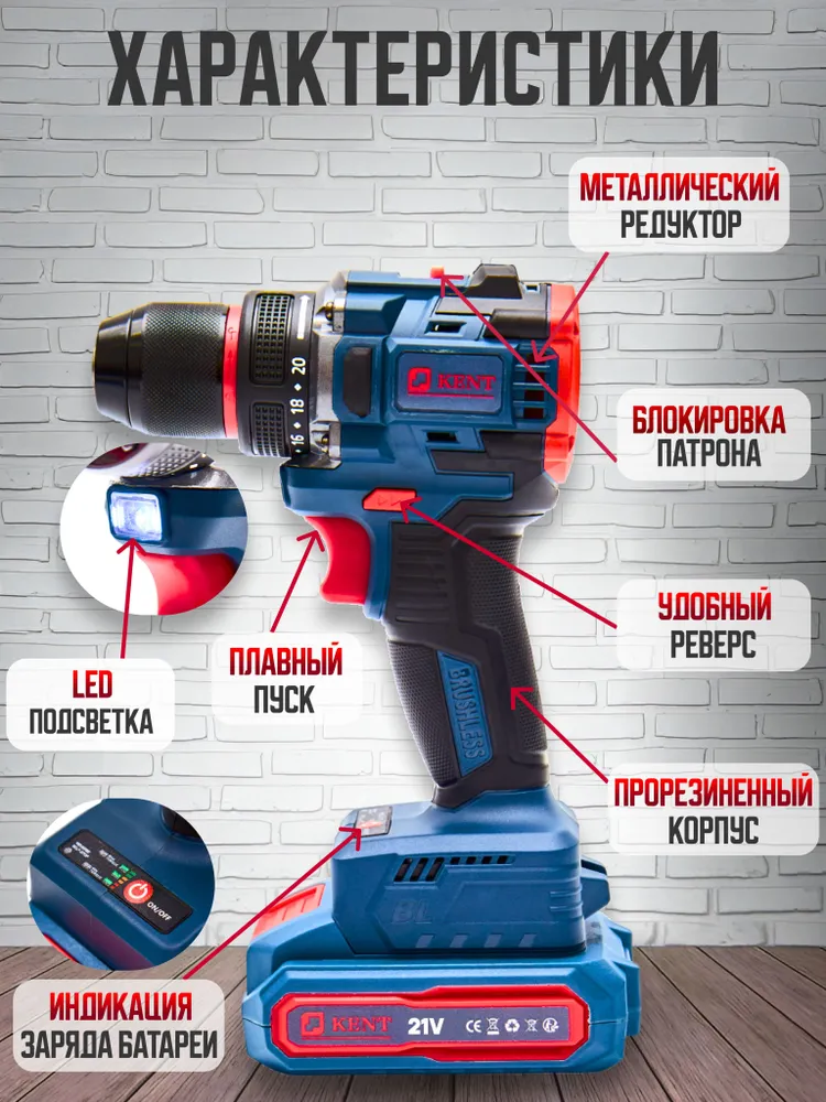 Шуруповерт аккумуляторный бесщеточный KENT 21V 2,5A