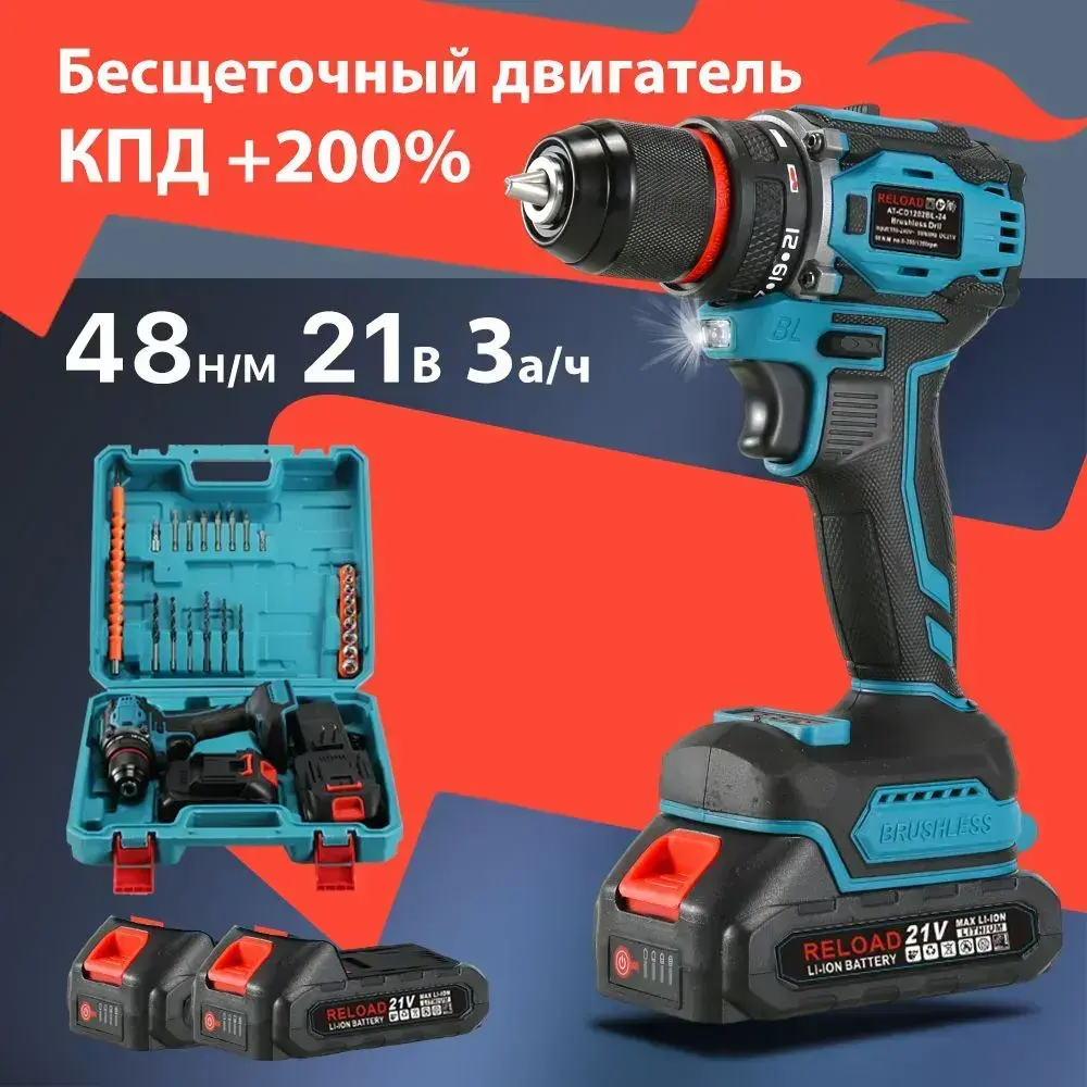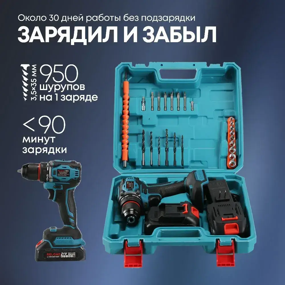 Шуруповерт дрель аккумуляторный бесщеточный ударный ударная дрель 21 В 2 Ач 60 н/м 1400 об/мин, профессиональная, с двумя аккумуляторами, с набором бит