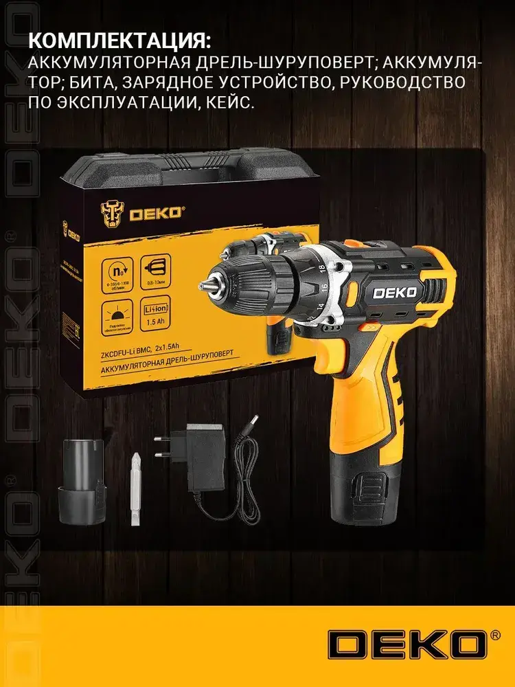 Шуруповерт дрель аккумуляторный DEKO ZKCDFU-Li в кейсе, 12В, 2х1.5Ач