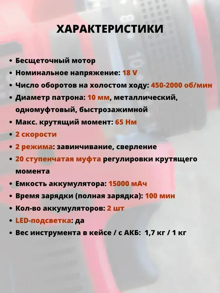 Шуруповерт TIELLIO X18T бесщеточный аккумуляторный электрический дрель в кейсе, 18В, 65Нм, 2 АКБ LI-ION, 1,5Ач