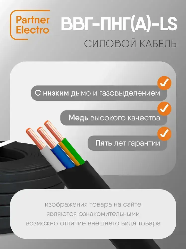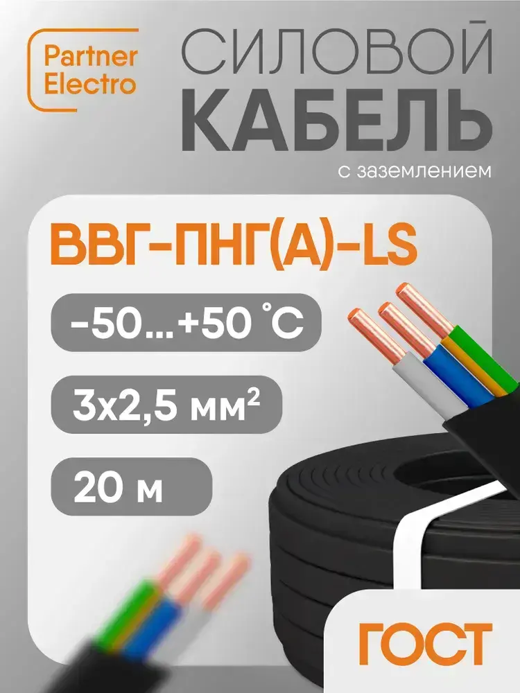 Силовой кабель ВВГ-Пнг(А)-LS 3х2,5 кв.мм, 20 м, Партнер-Электро