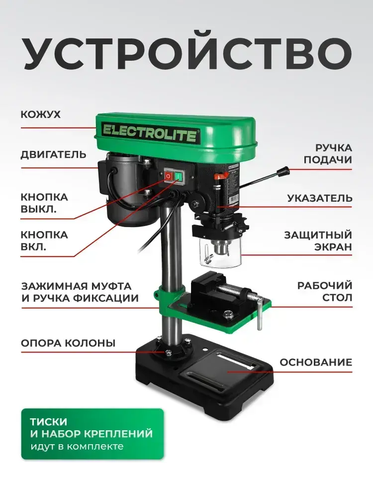 Станок сверлильный настольный СС-450/13 (450 Вт, 13 мм патрон, 5 скоростей, ТИСКИ В КОМПЛЕКТЕ) ELECTROLITE