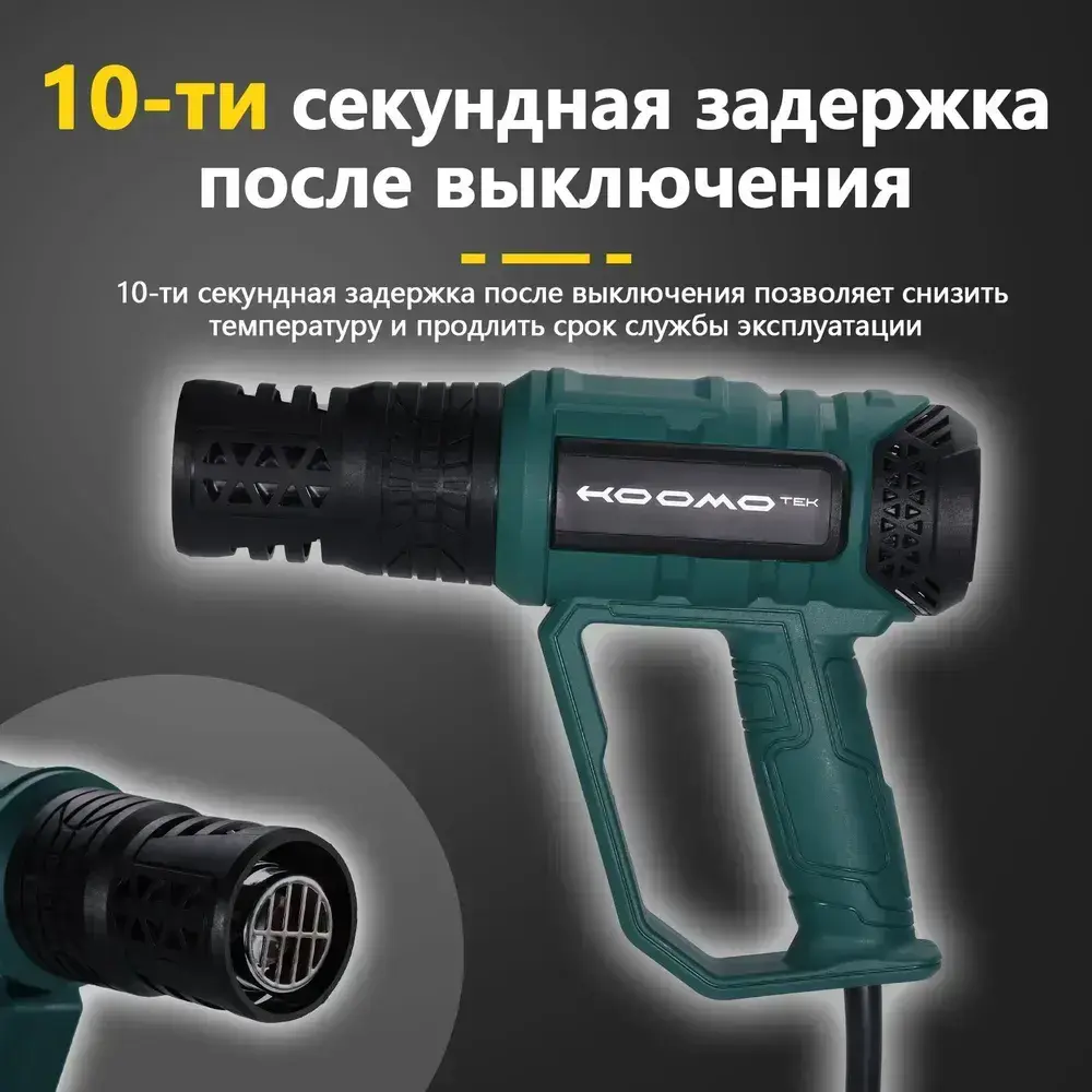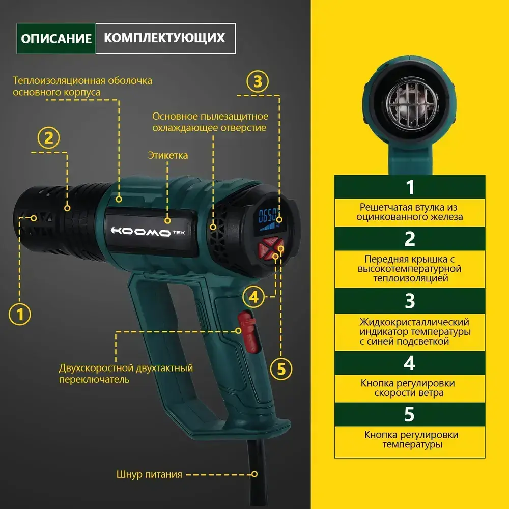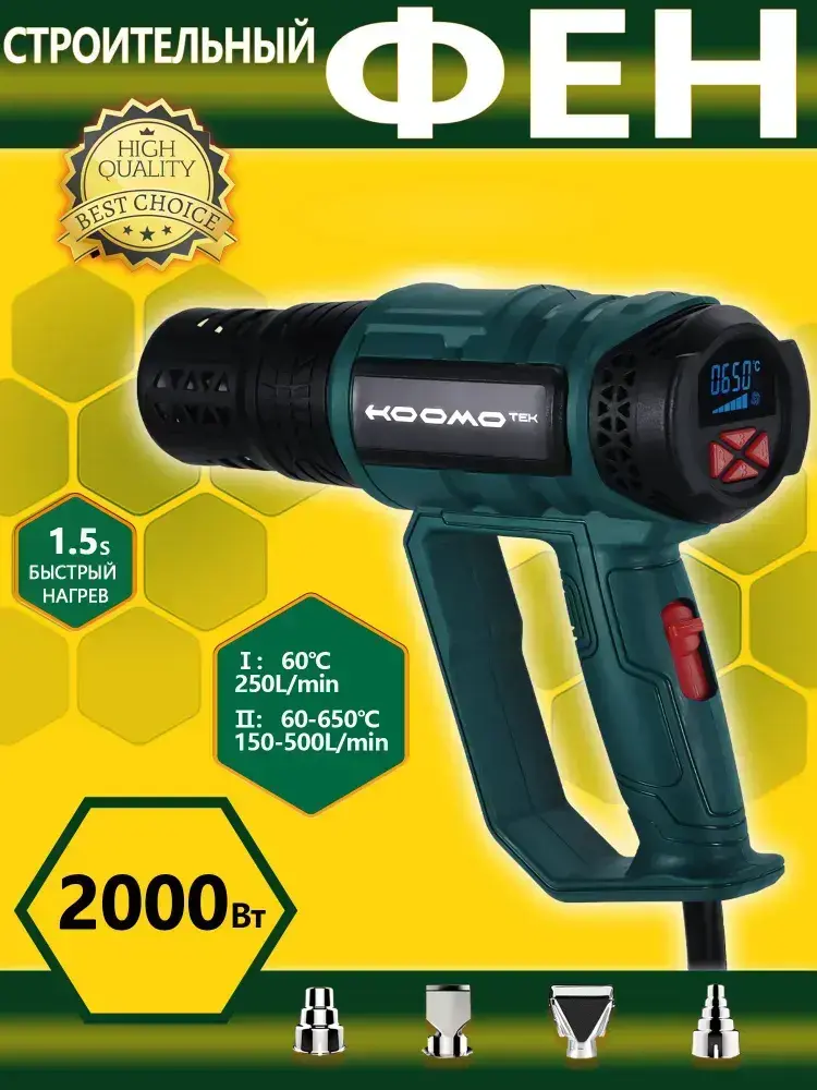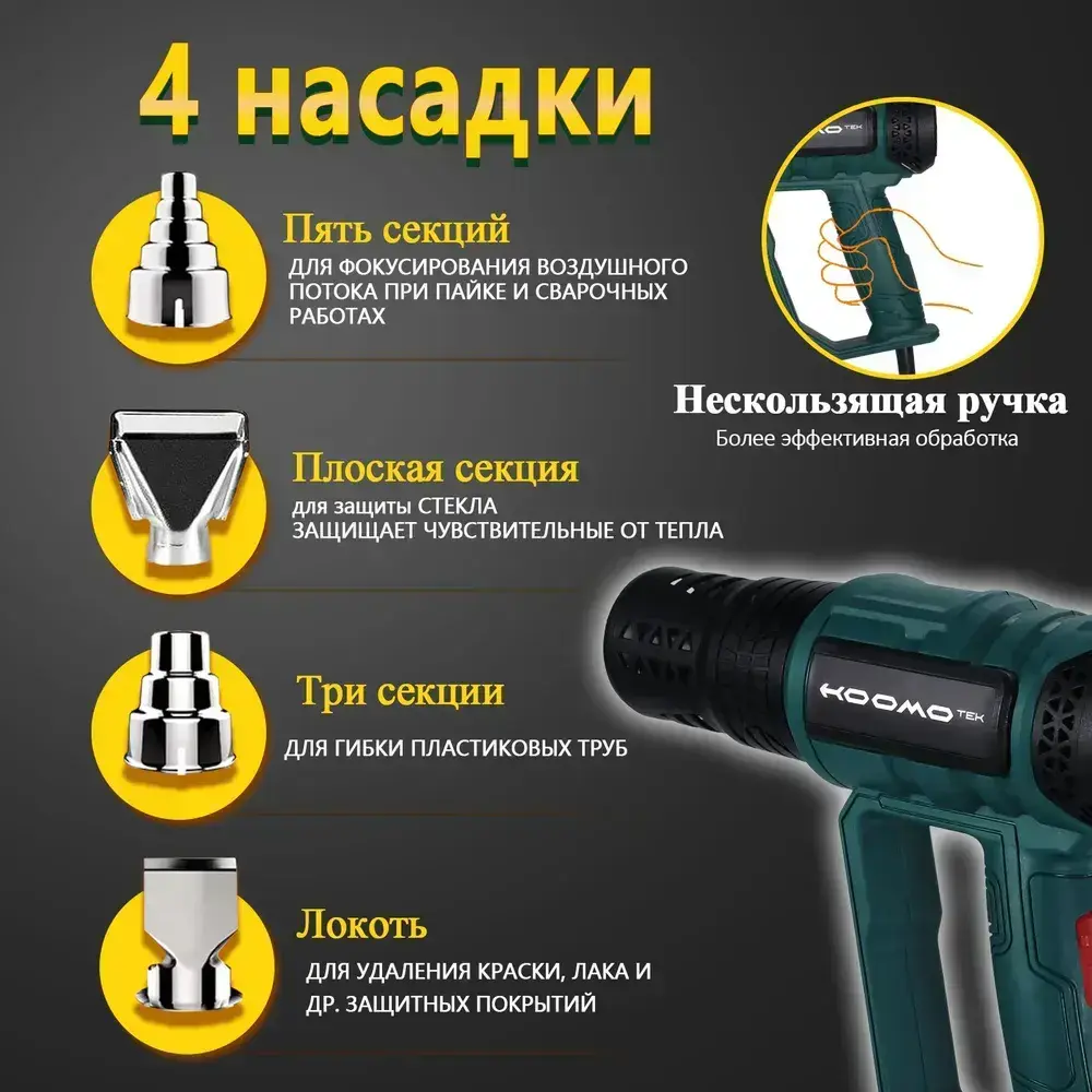 Строительный фен/Промышленный фен 2000 Вт, 60-650 градусов, бесступенчатая регулировка температуры,С дисплеем, 4 насадки