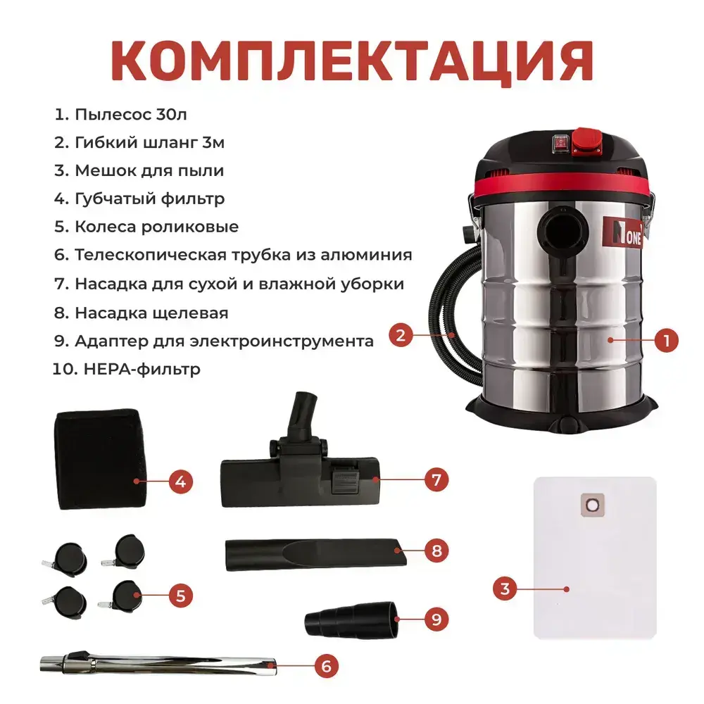 Строительный пылесос NUMBER ONE VC1500/30-1 30л, 1500Вт, 3м шланг, пылесборник.