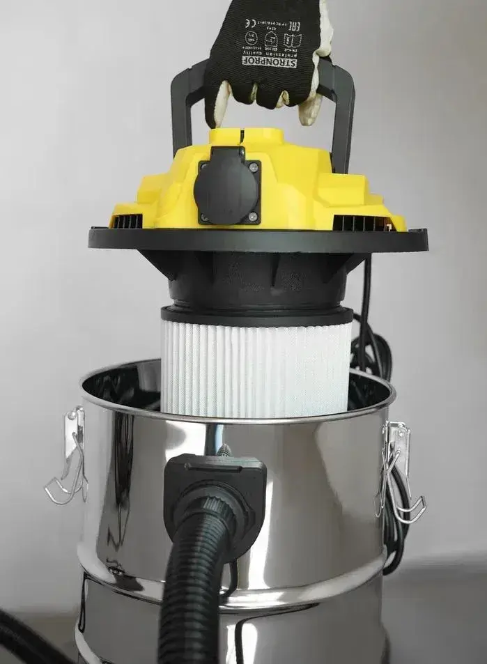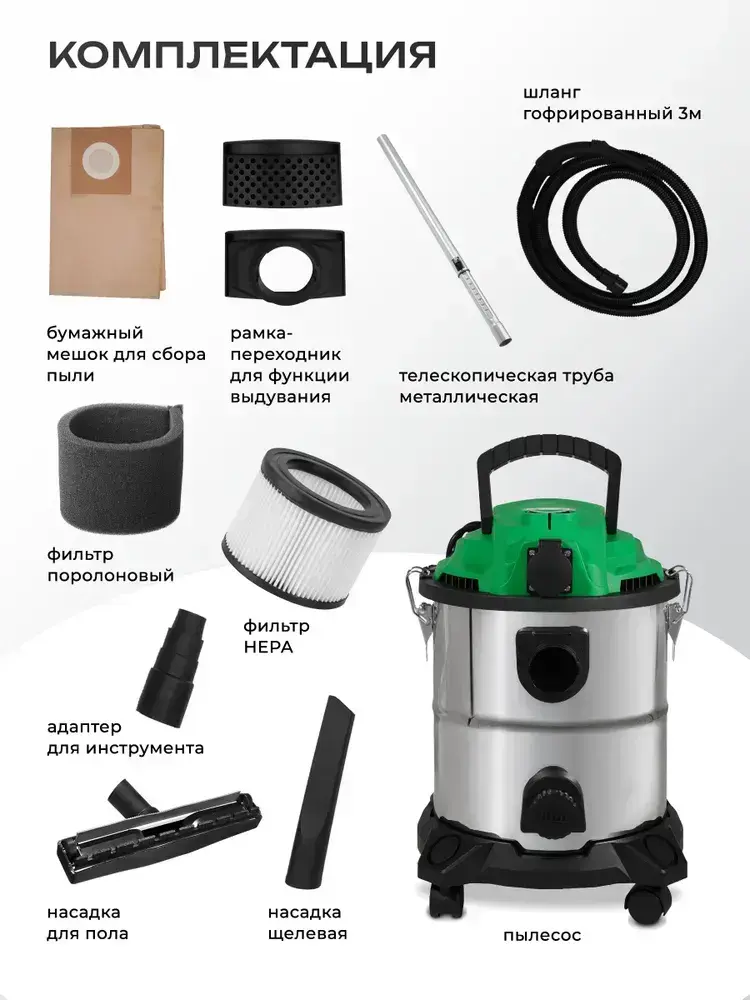 Строительный пылесос, промышленный, электрический Electrolite ПС-20С( 1500 Вт, 20 литров, Шланг 3 М, НЕРА фильтр, сухая/влажная уборка, розетка для инструмента )