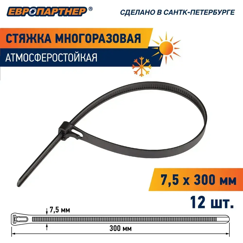 Стяжка пластиковая многоразовая нейлон 300х7,5мм черная PRM Европартнер (12шт.)