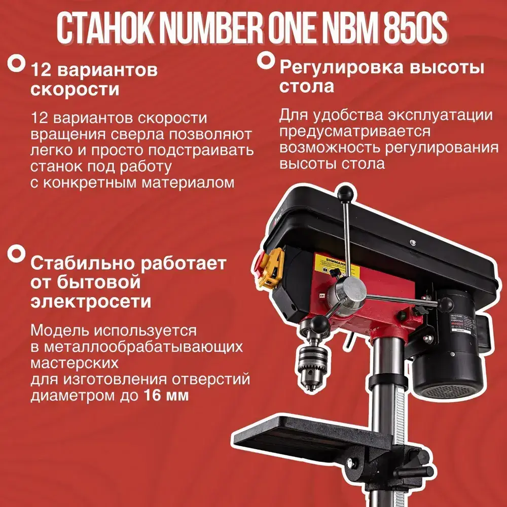 Сверлильный станок стационарный NUMBER ONE NBM 850S (850Вт,12 скоростей,16мм,220-2450об/мин)+тиски №1