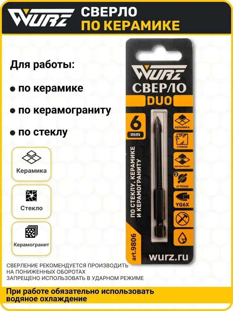 Сверло Duo (2 грани) 6мм, по керамике, керамограниту и стеклу WURZ 9806