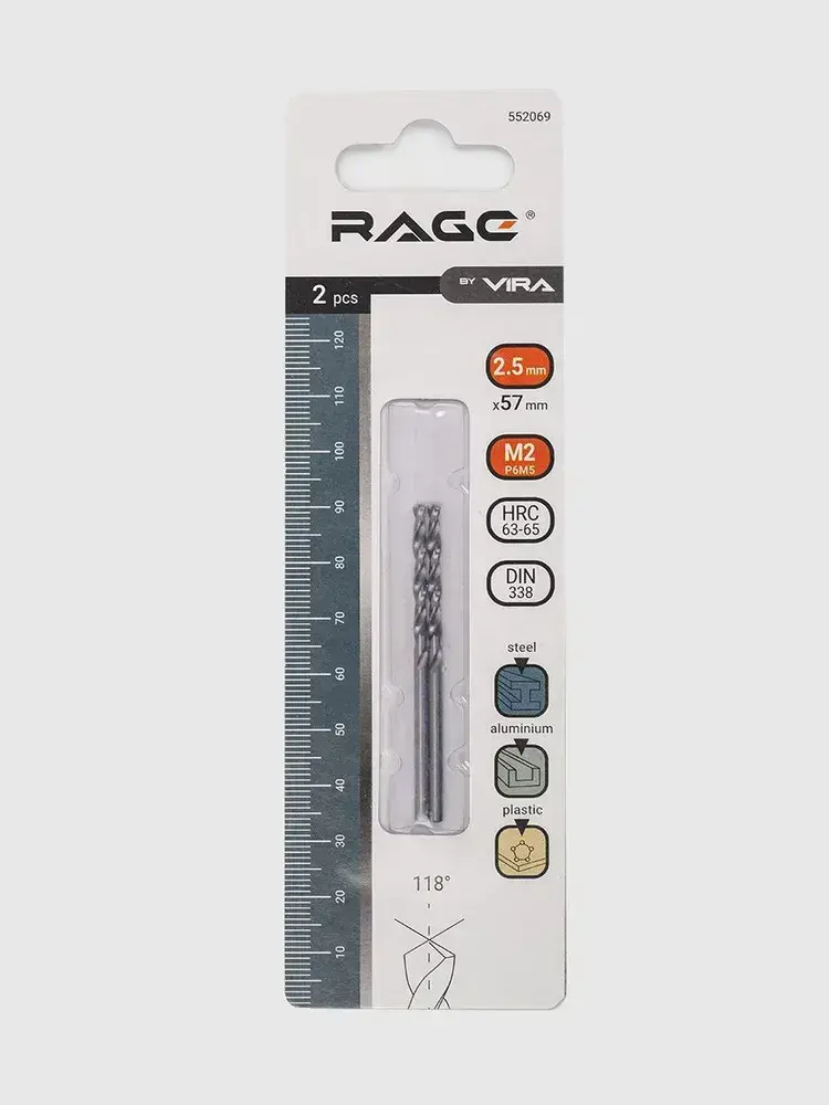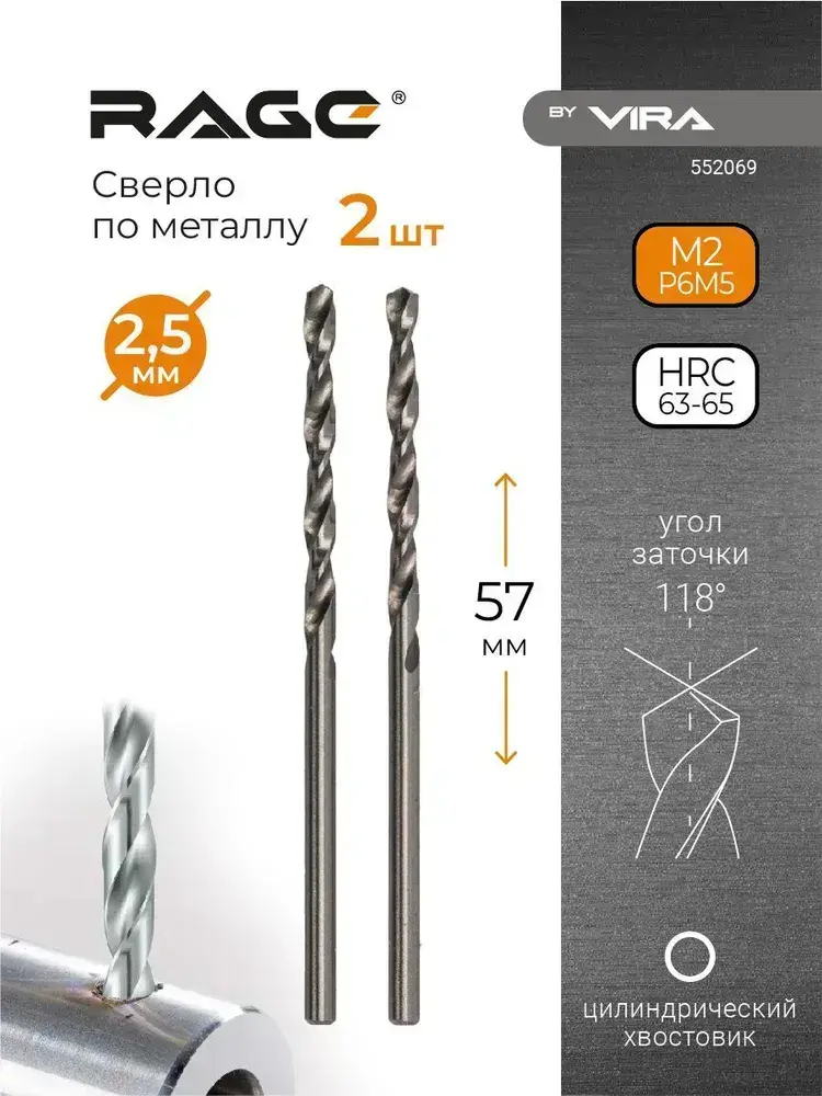 Сверло по металлу 2.5 мм P6M5 2 шт RAGE by VIRA
