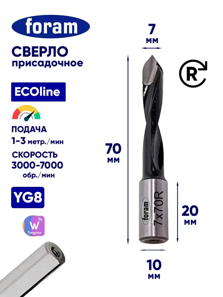 Сверло сквозное присадочное FORAM D7x45x70-RH Правое вращение