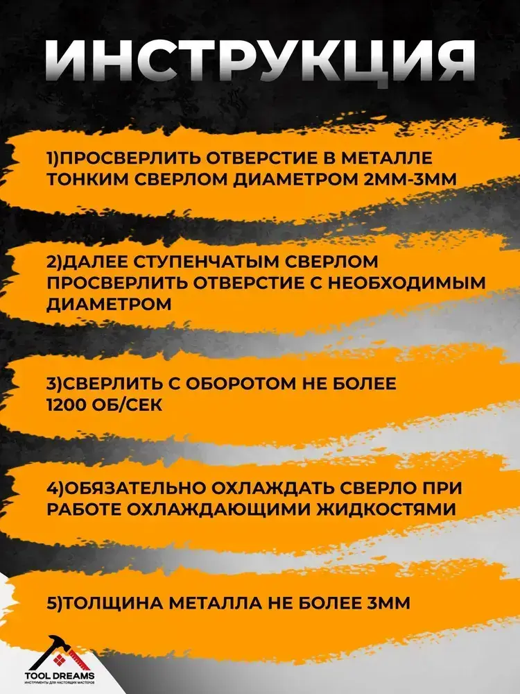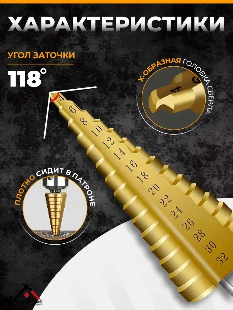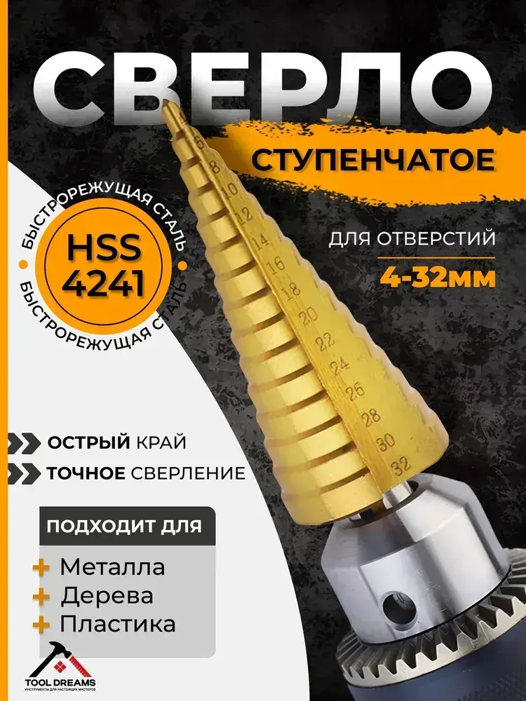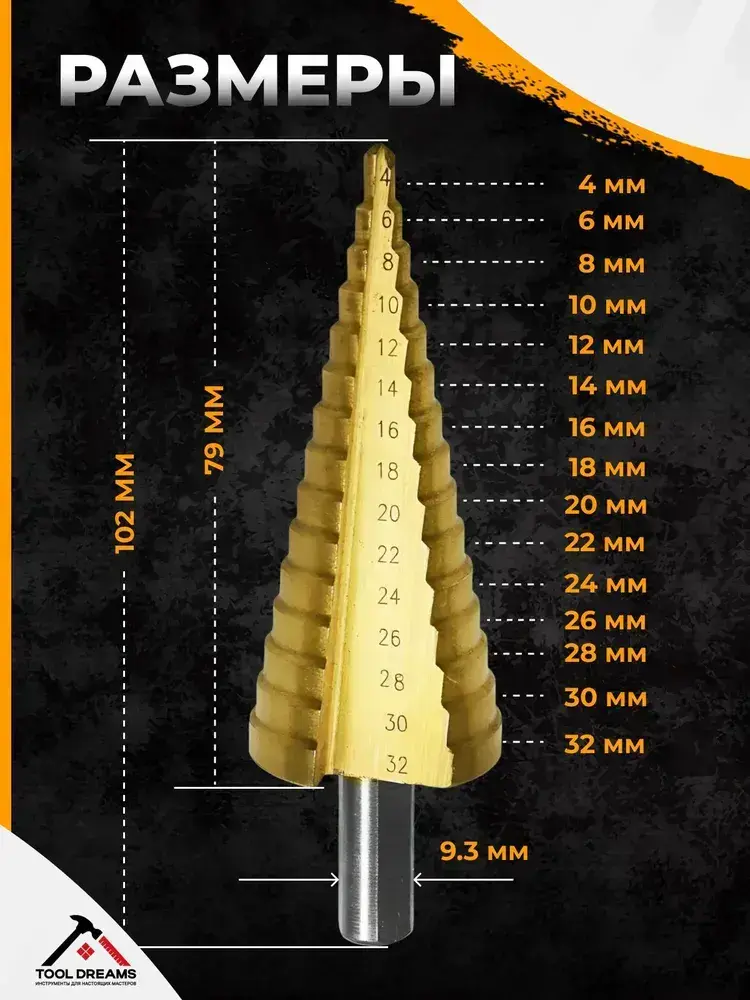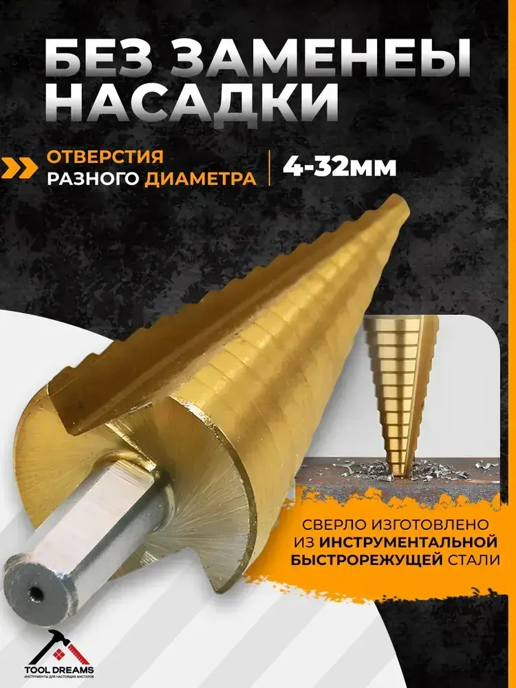 Сверло ступенчатое по металлу для отверстий 4-32 мм, с титановым покрытием