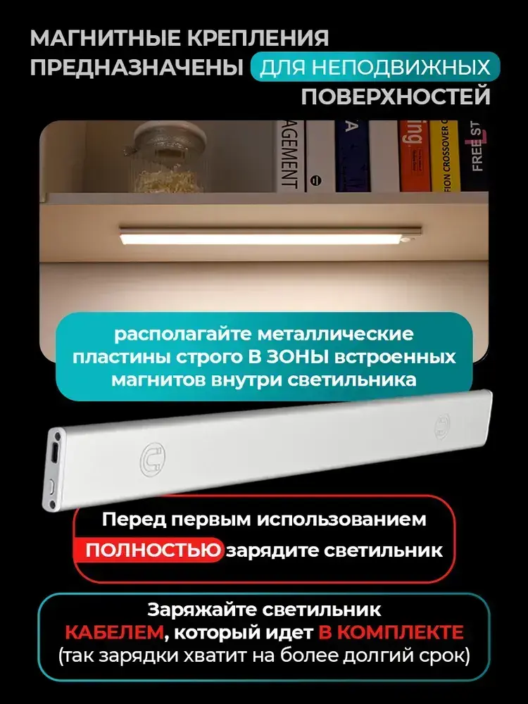 Светильник 40 см с датчиком движения беспроводной аккумуляторный, на магнитах, умный, на кухню, в шкаф