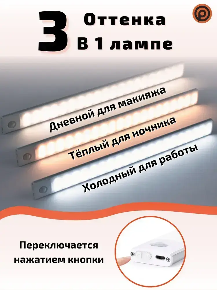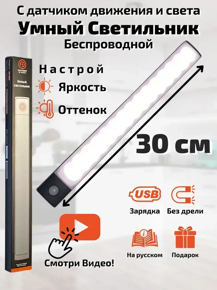 Светильник с датчиком движения 30 см, беспроводная лампа, LED подсветка на кухню в шкаф, датчик света и регулируемая температура свечения, на аккумуляторе