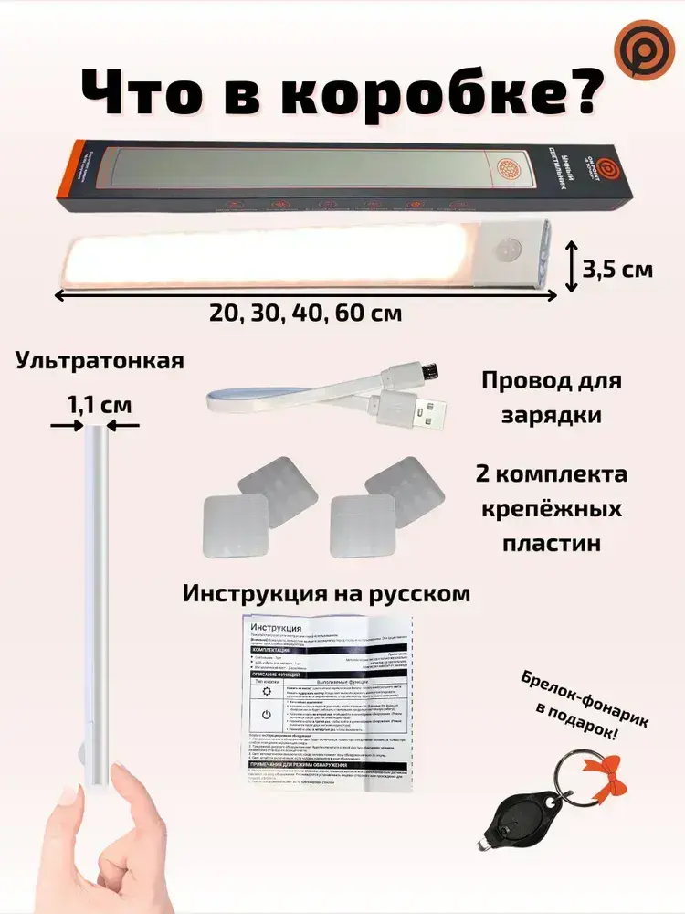 Светильник с датчиком движения, 60 см беспроводной, на аккумуляторе