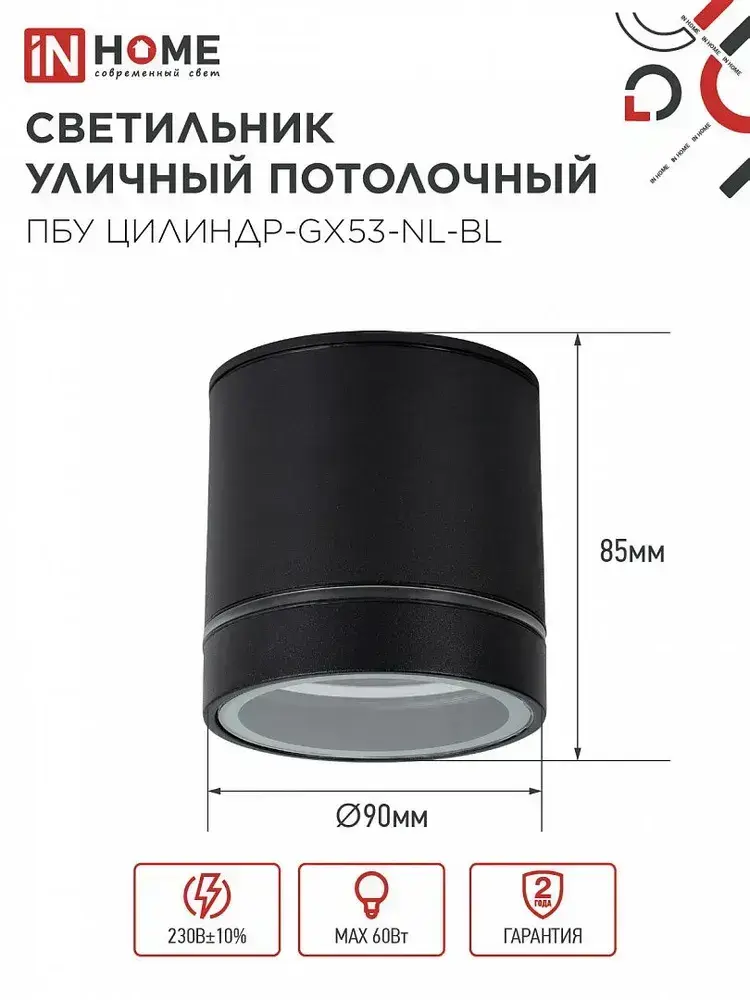 Светильник уличный потолочный ПБУ ЦИЛИНДР-1xGX53-NL-BL с подсветкой алюм черный IP54 IN HOME
