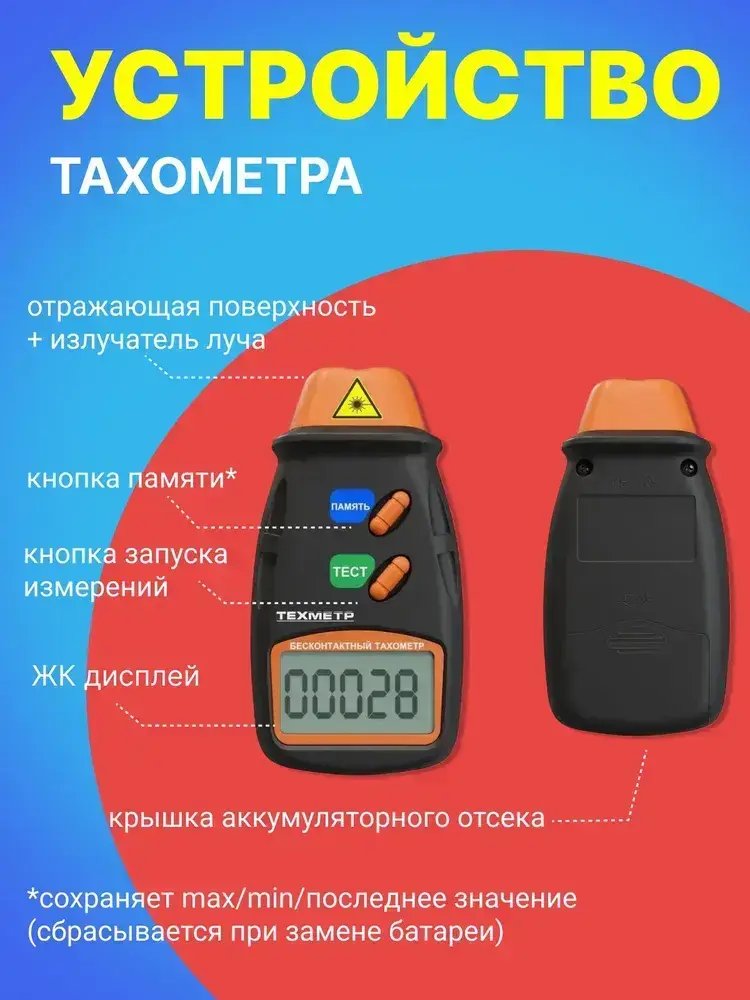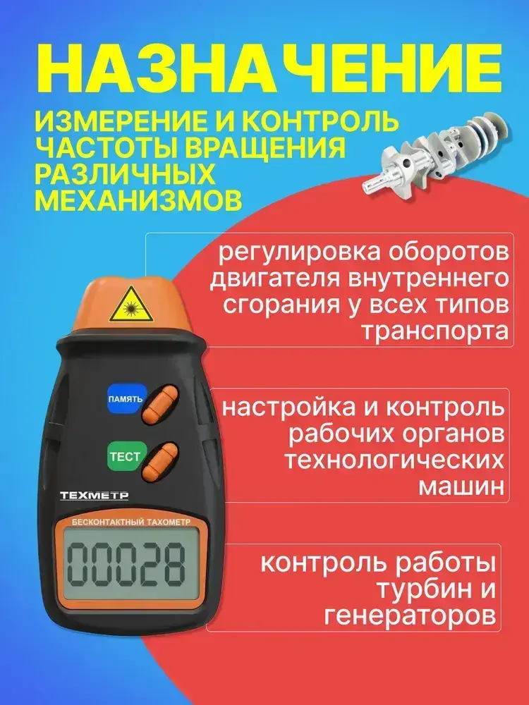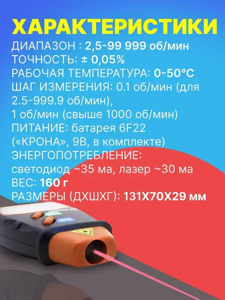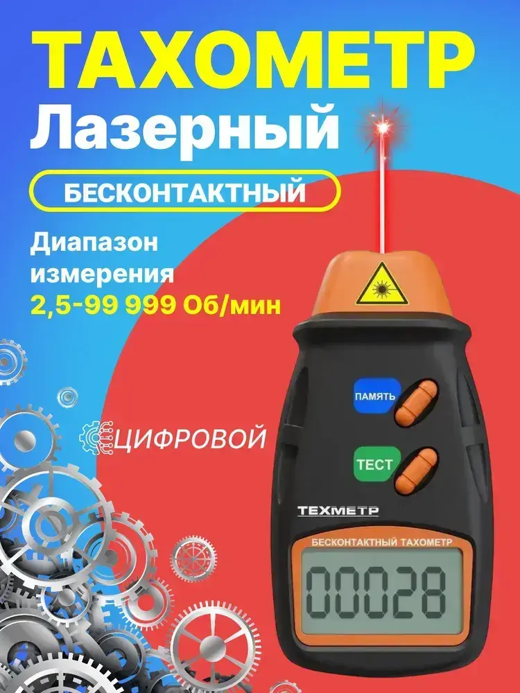 Тахометр лазерный цифровой бесконтактный ТЕХМЕТР ЦТ-1 (2.5-99999 об./мин.) (Черный)