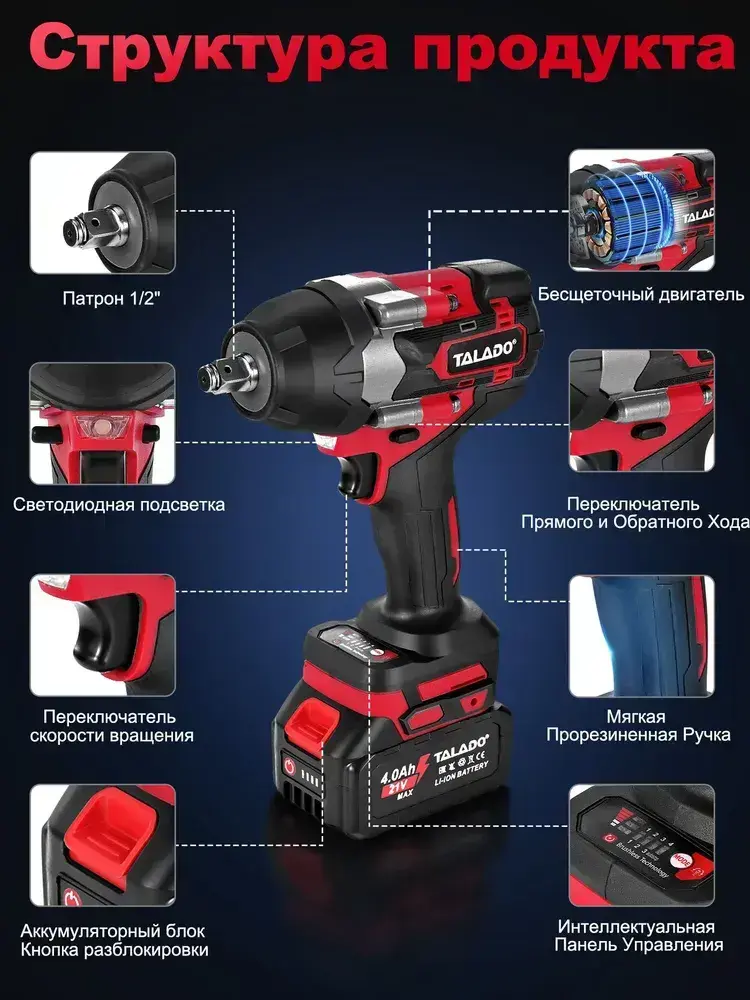 TALADO Гайковерт аккумуляторный ударный мощный 1800 Нм 21 В с 2 Li-ion аккумулятор 4Ач