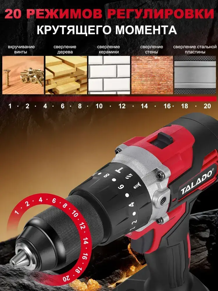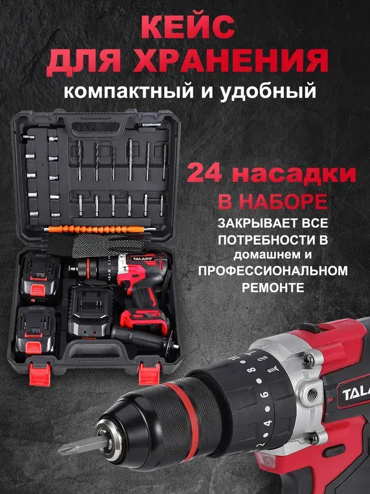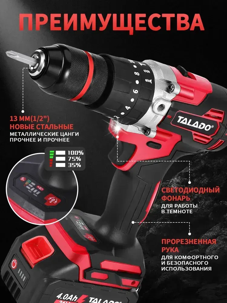 TALADO шуруповерт аккумуляторный бесщеточный 13мм шуруповерт для ледобура 120 HM 21В с двумя аккумуляторами 4 Ач
