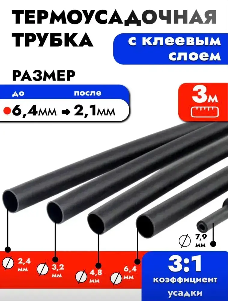 Термоусадка для проводов с клеевым слоем 3 метра черная, 6,4мм. Термоусадочная трубка для проводов. Диаметр 6,4.
