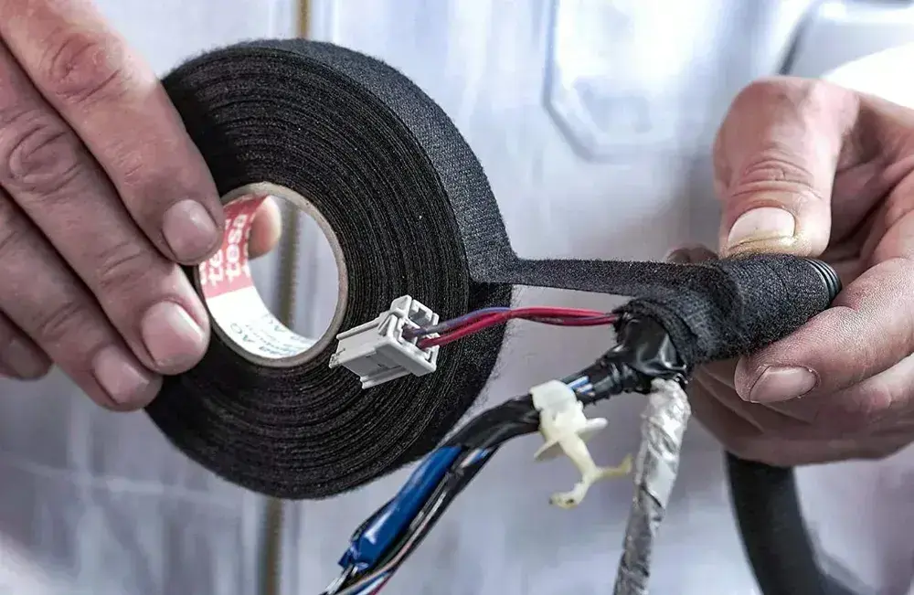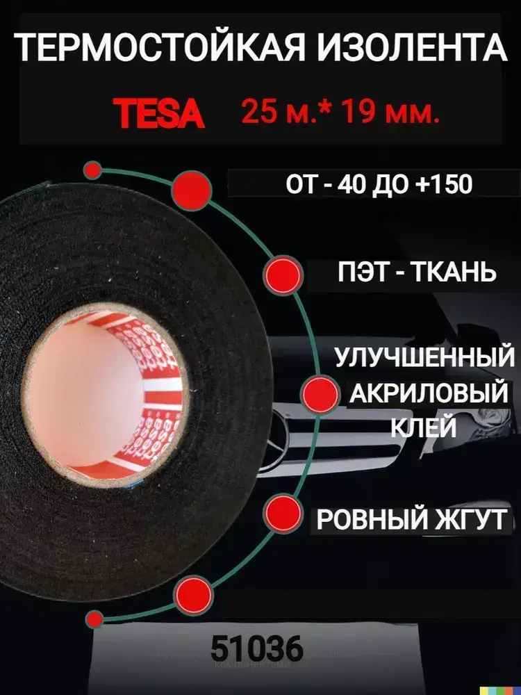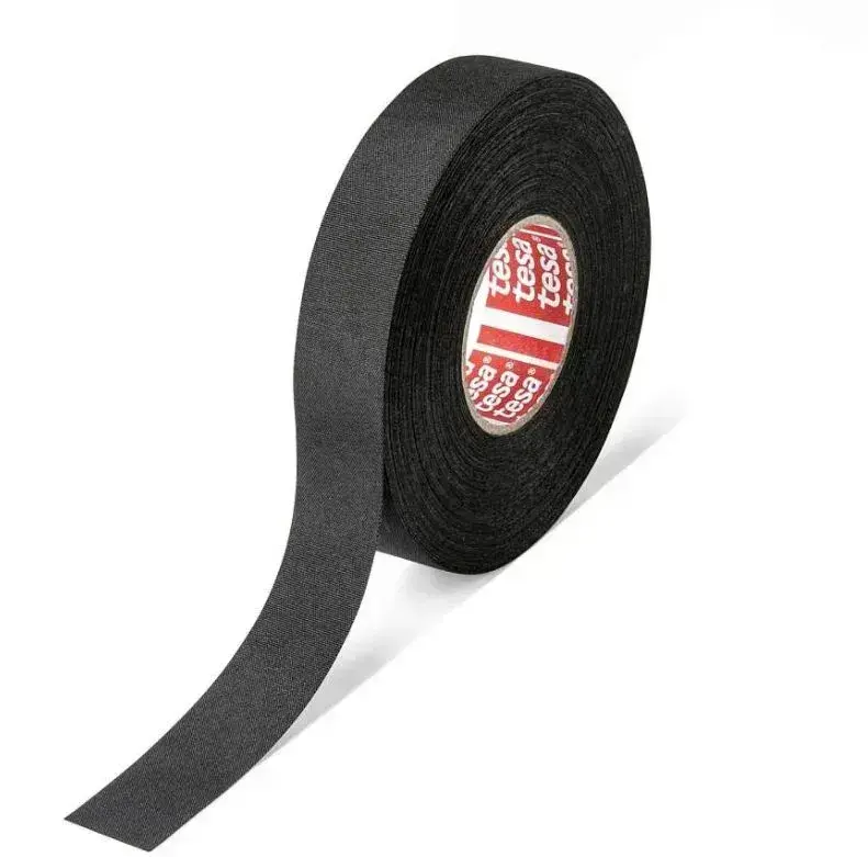tesa Изолента 51036, 1 шт. 25 м. автомобильная термостойкая черная подкапотная тканевая для жгутования, ПЭТ-ткань лавсан, скрутка для проводов, обмотка