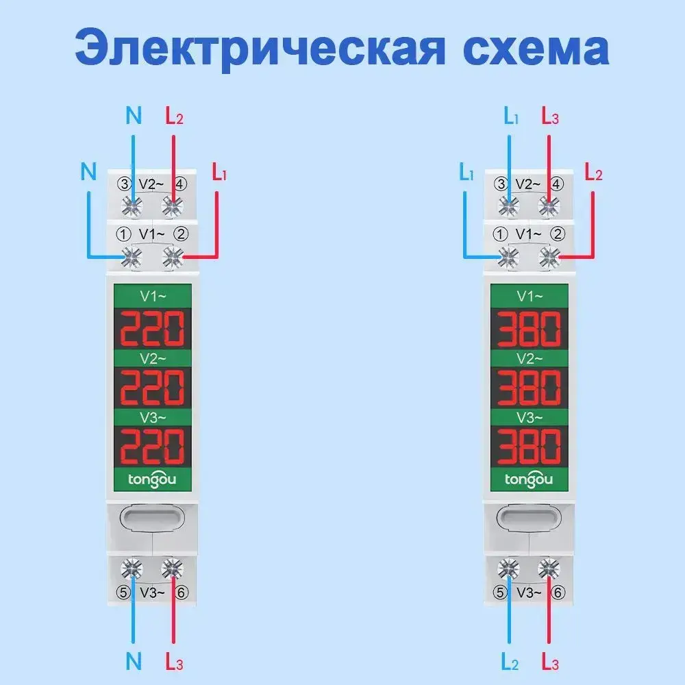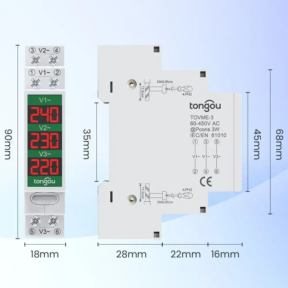 Трехфазный измеритель напряжения переменного тока 60 В-450 В на Din-рейке, Мини-модульный вольтметр, Индикатор датчика, светодиодный цифровой дисплей, детектор TONGOU
