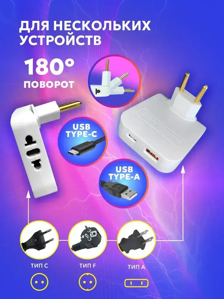 Тройник белый плоский поворотный для розетки, разветвитель 180 градусов, с двумя USB Type-A и Type-С