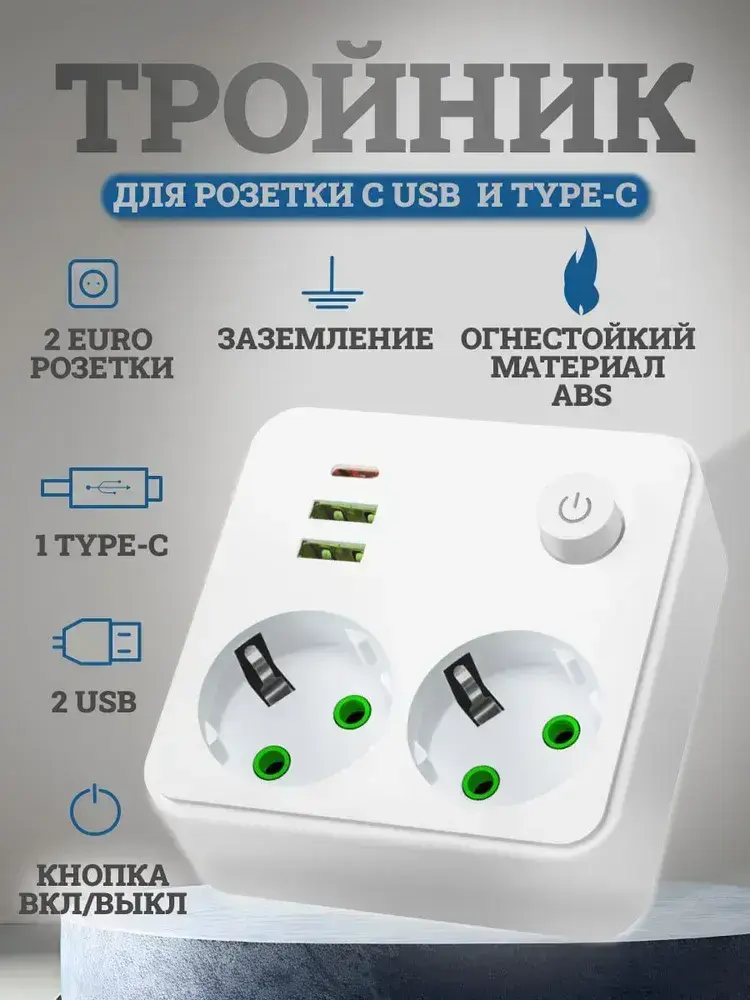 Тройник для розетки электрический с USB и TYPE-C, двойник для розетки с заземлением и кнопкой выключателем