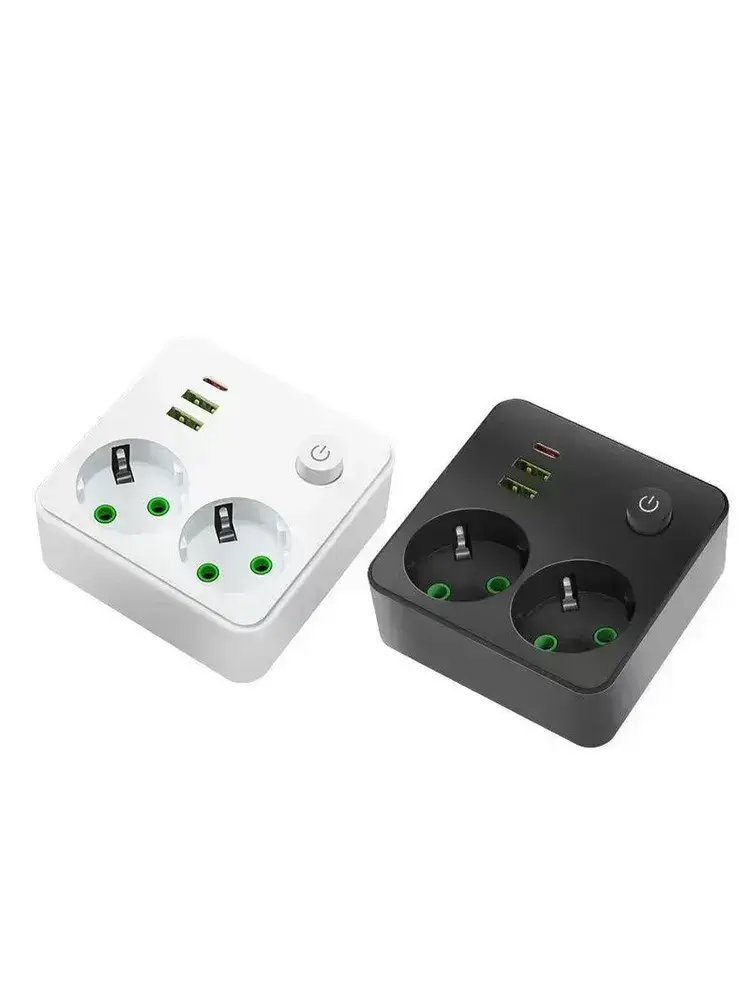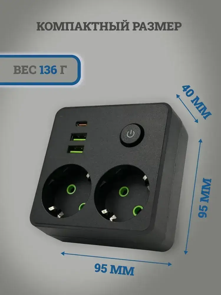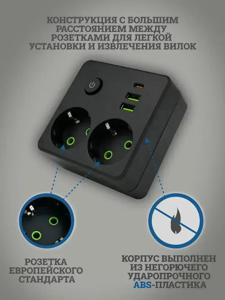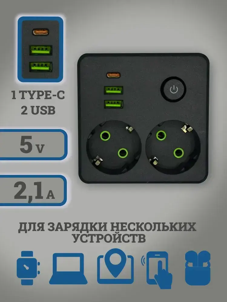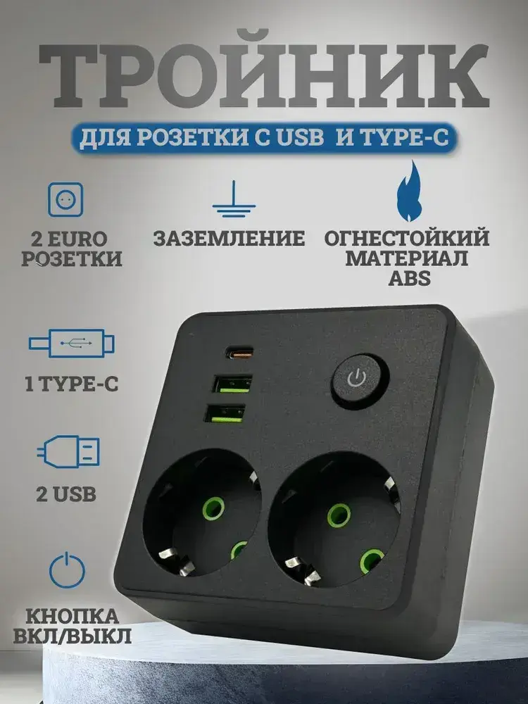 Тройник для розетки электрический с заземлением и кнопкой выключателем, двойник для розетки с USB и TYPE-C