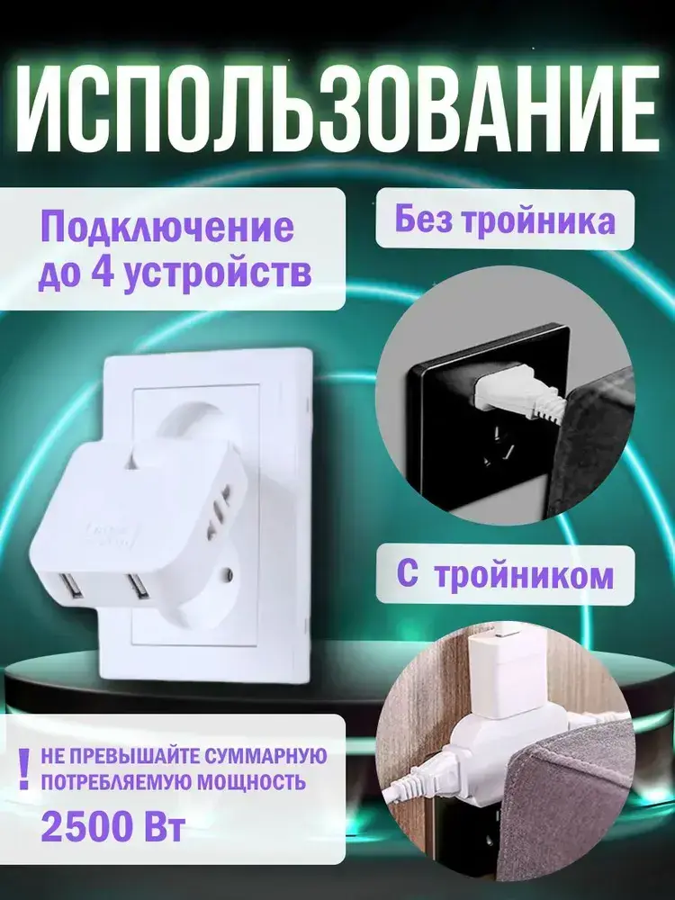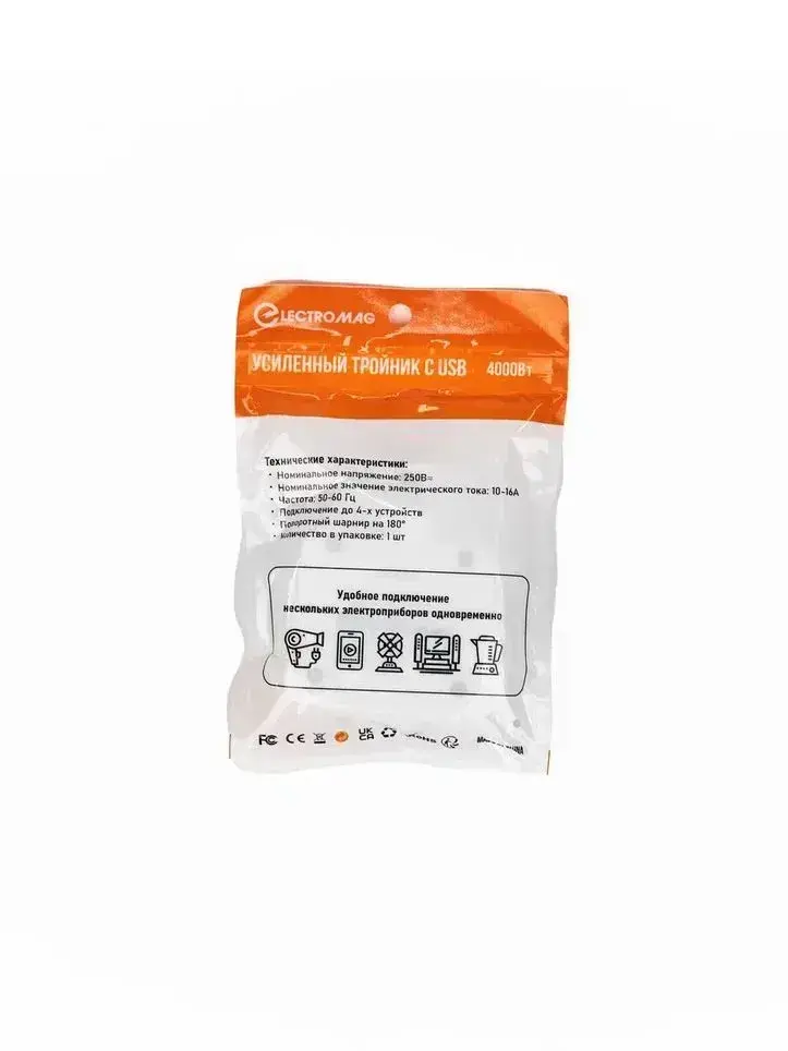 Тройник для розетки плоский с usb 2,0 усиленный поворотный разветвитель электрический на 16А ElectroMag