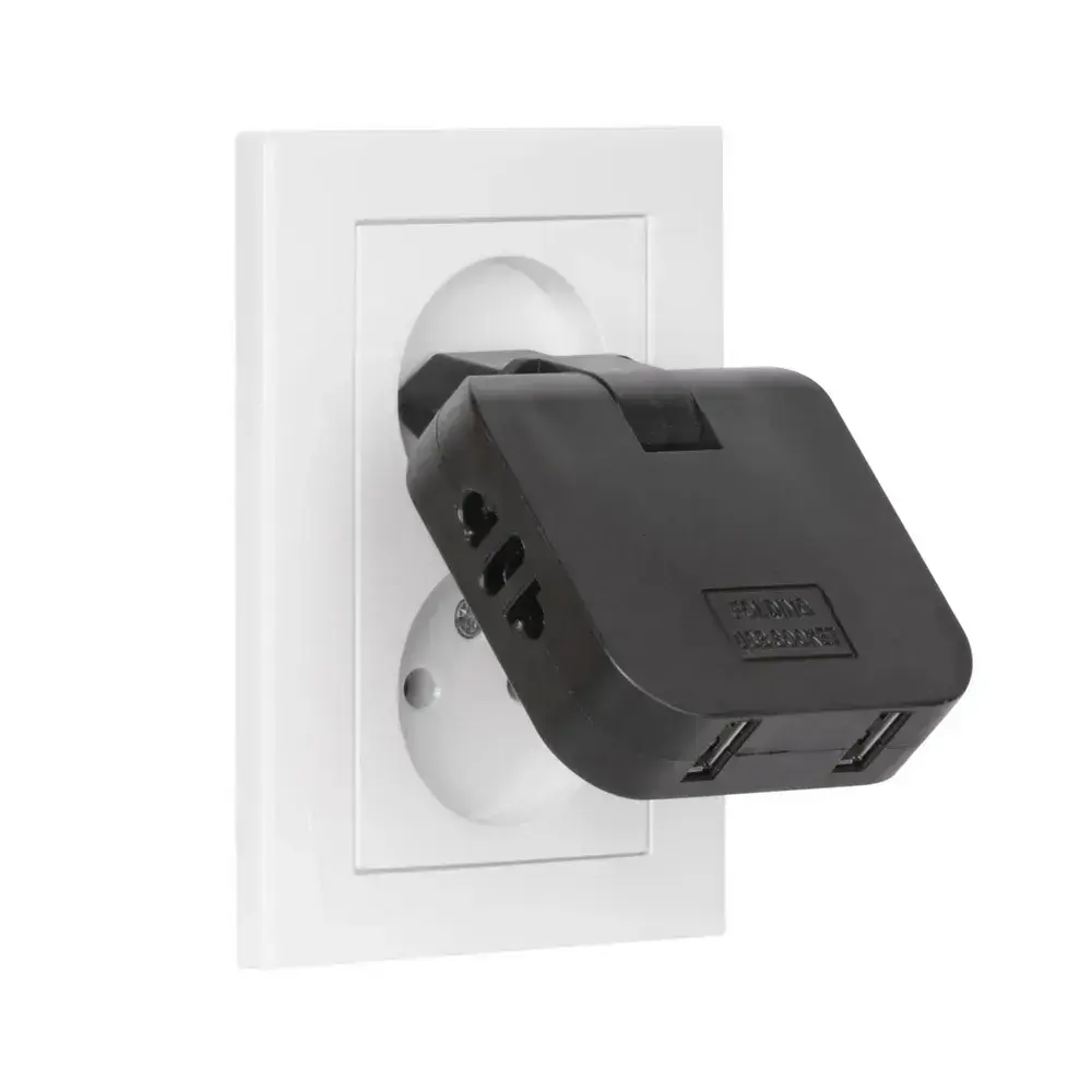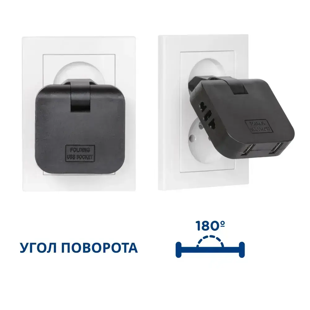 Тройник для розетки с USB плоский поворотный, USB разветвитель 180 градусов, черный усиленный тройник 16А