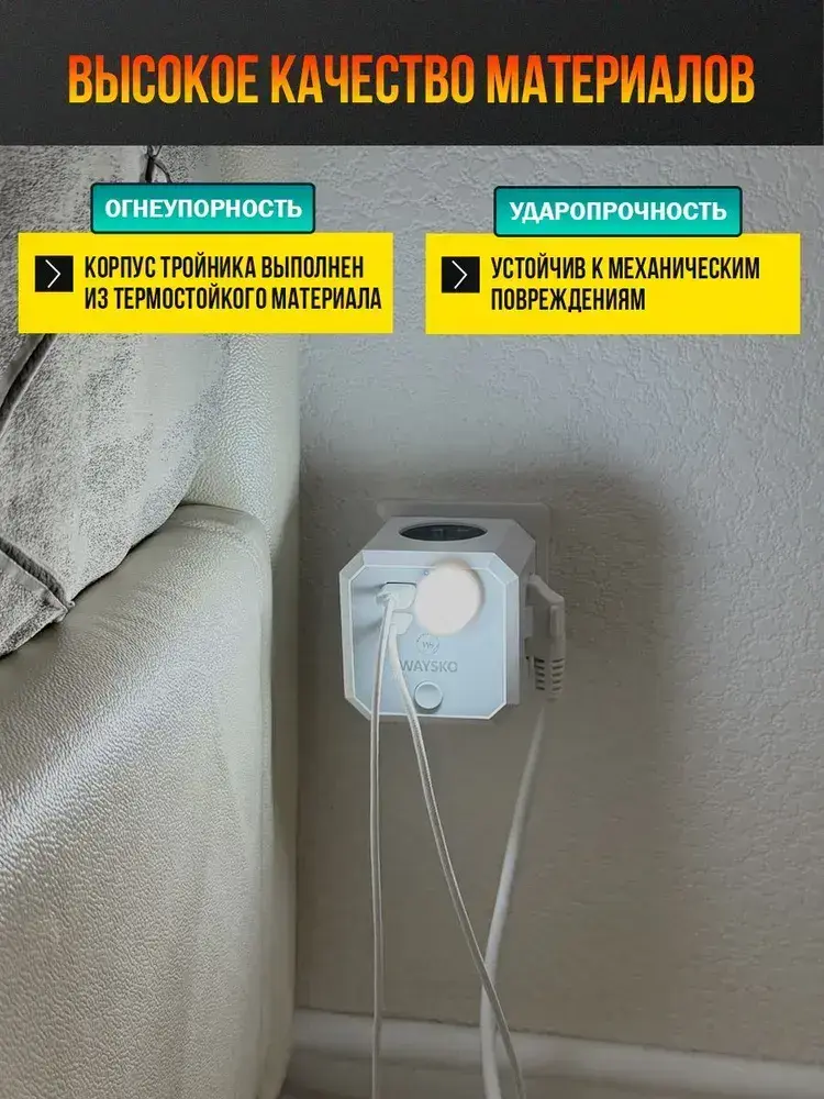 Тройник для розетки сетевой куб WAYSKO, 4 евро розетки 220V с заземлением, 2 USB, 2 Type-C, 16 A / 4000 Вт, разветвитель с выключателем, белый