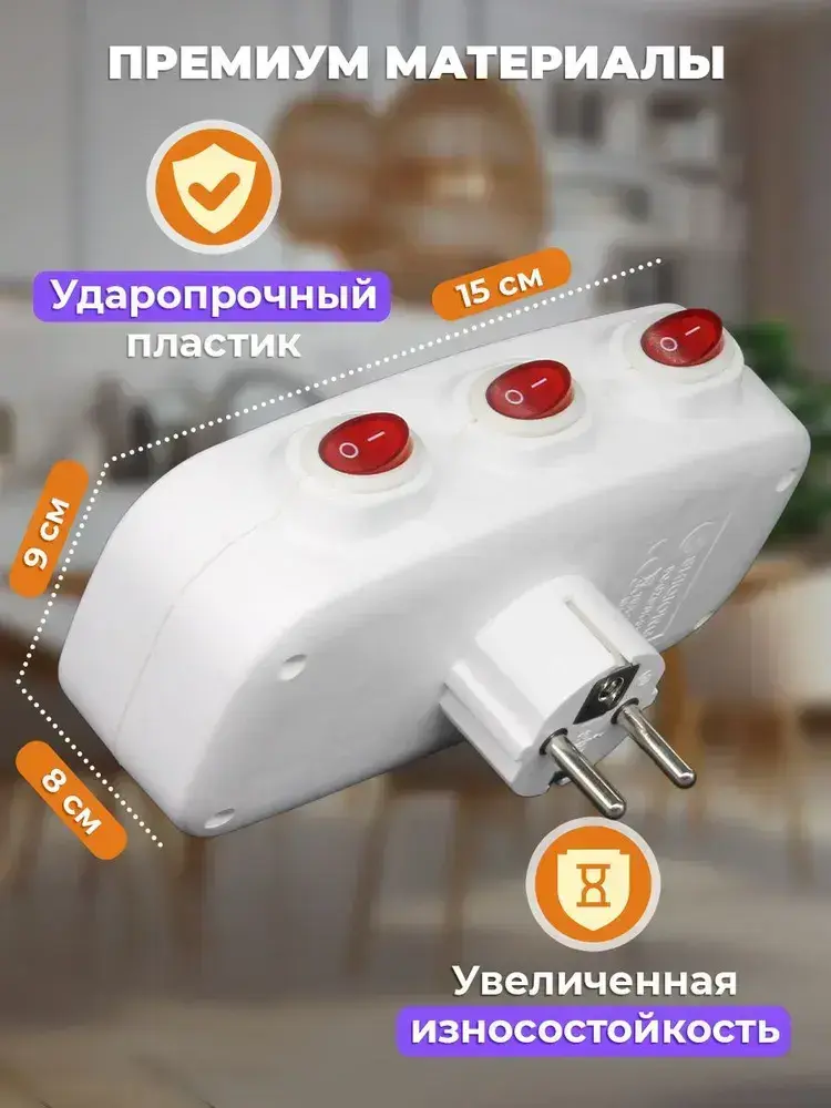 Тройник электрический с выключателем, Разветвитель с заземлением и защитой от детей 16А 250В