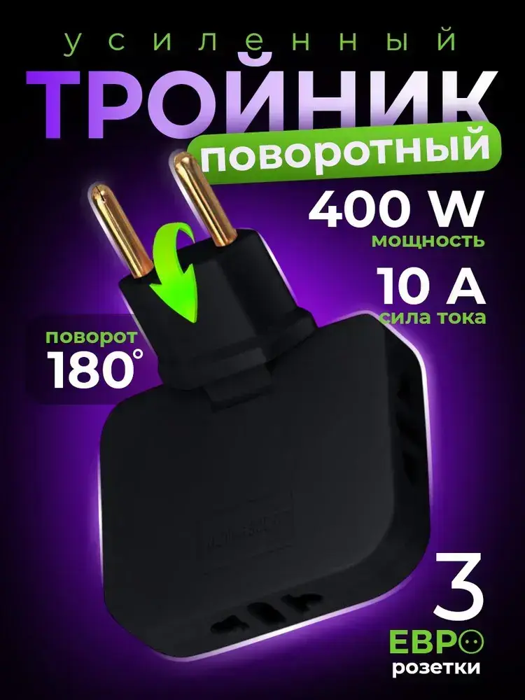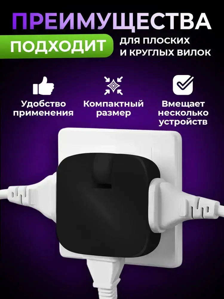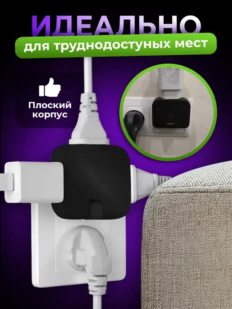 Тройник плоский поворотный для розетки, разветвитель 180 градусов, цвет черный