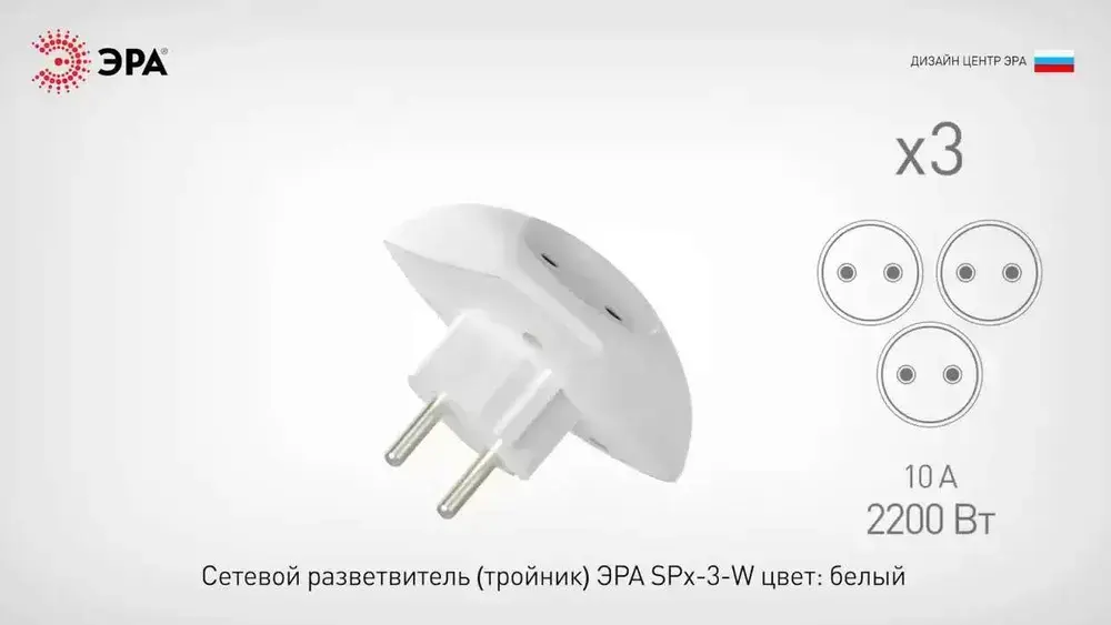 Тройник розетка электрический плоский SPx-3-W ЭРА / Разветвитель электрический без заземления, 3 розетки, 10А, белый
