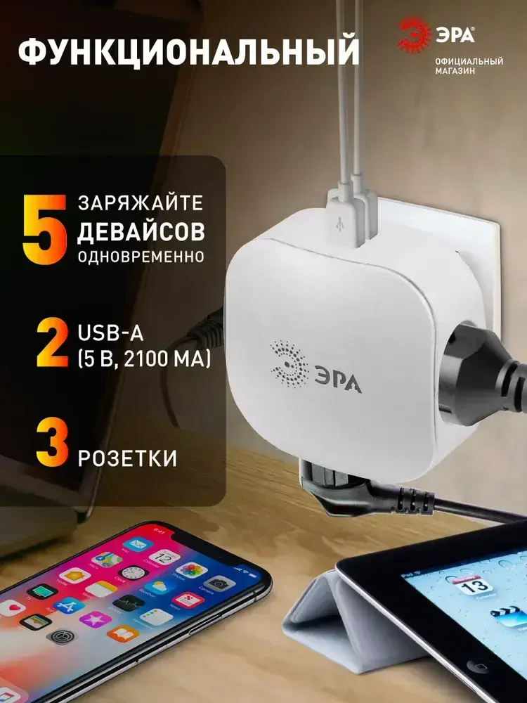 Тройник SP-3e-USB-2A ЭРА / Тройник розетка электрический с usb / usb разветвитель электрический с заземлением, со шторками, 1 розетка, плоский, 16А, белый