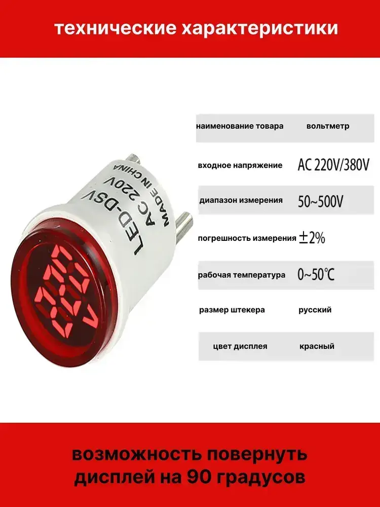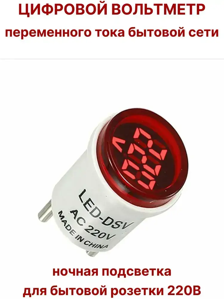 Цифровой вольтметр переменного тока бытовой сети в розетку 220В, красный дисплей
