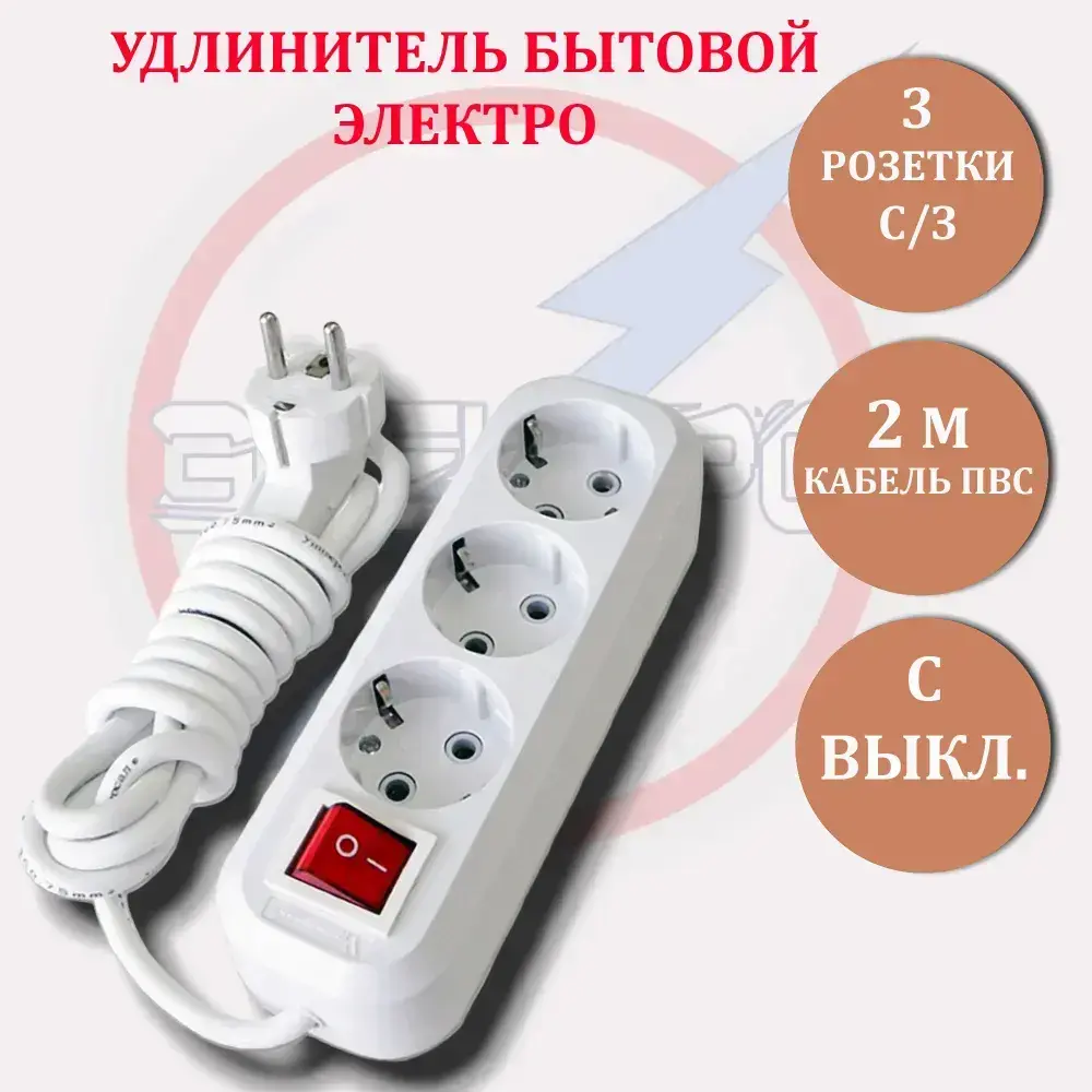 Удлинитель 16А 1682 3 розетки с заземлением, 2 метра с выключателем
